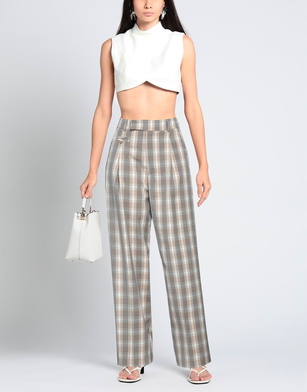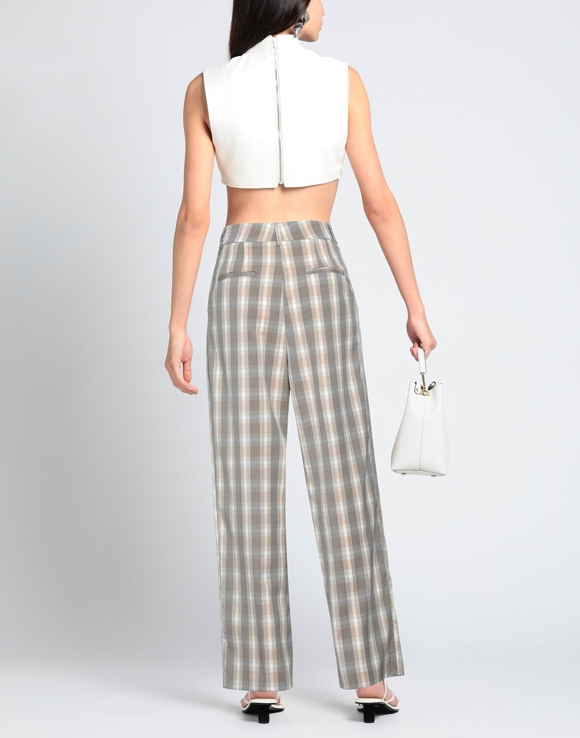 Полотняное переплетение, вытачки, узор в клетку «тартан», завышенная талия, шлевки для ремня, зауженная брючина, стандартный крой, застежка-молния, застежка на крючки, множество карманов, эластичный, индивидуальный пошив