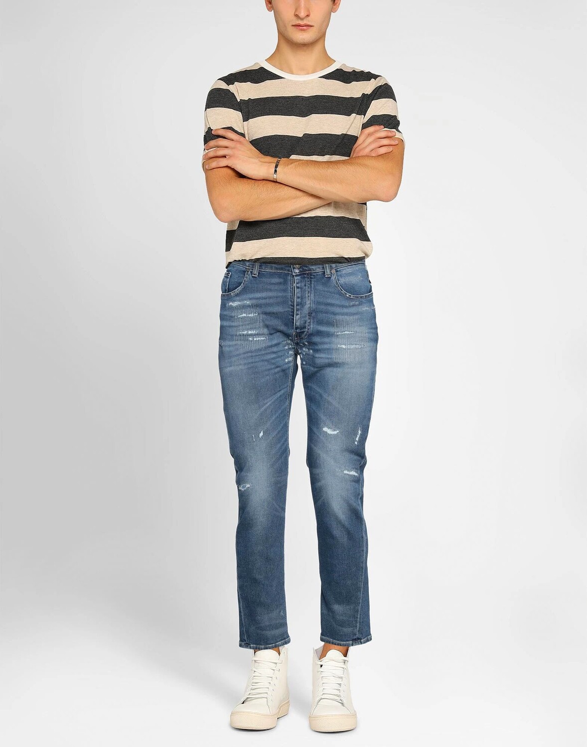 Деним, выцветший, эффект потертости, логотип бренда, одноцветное изделие, средняя степень стирки, кулиска на талии, зауженные брючины, узкие брюки, пуговицы, пять карманов, стрейч, средняя посадка