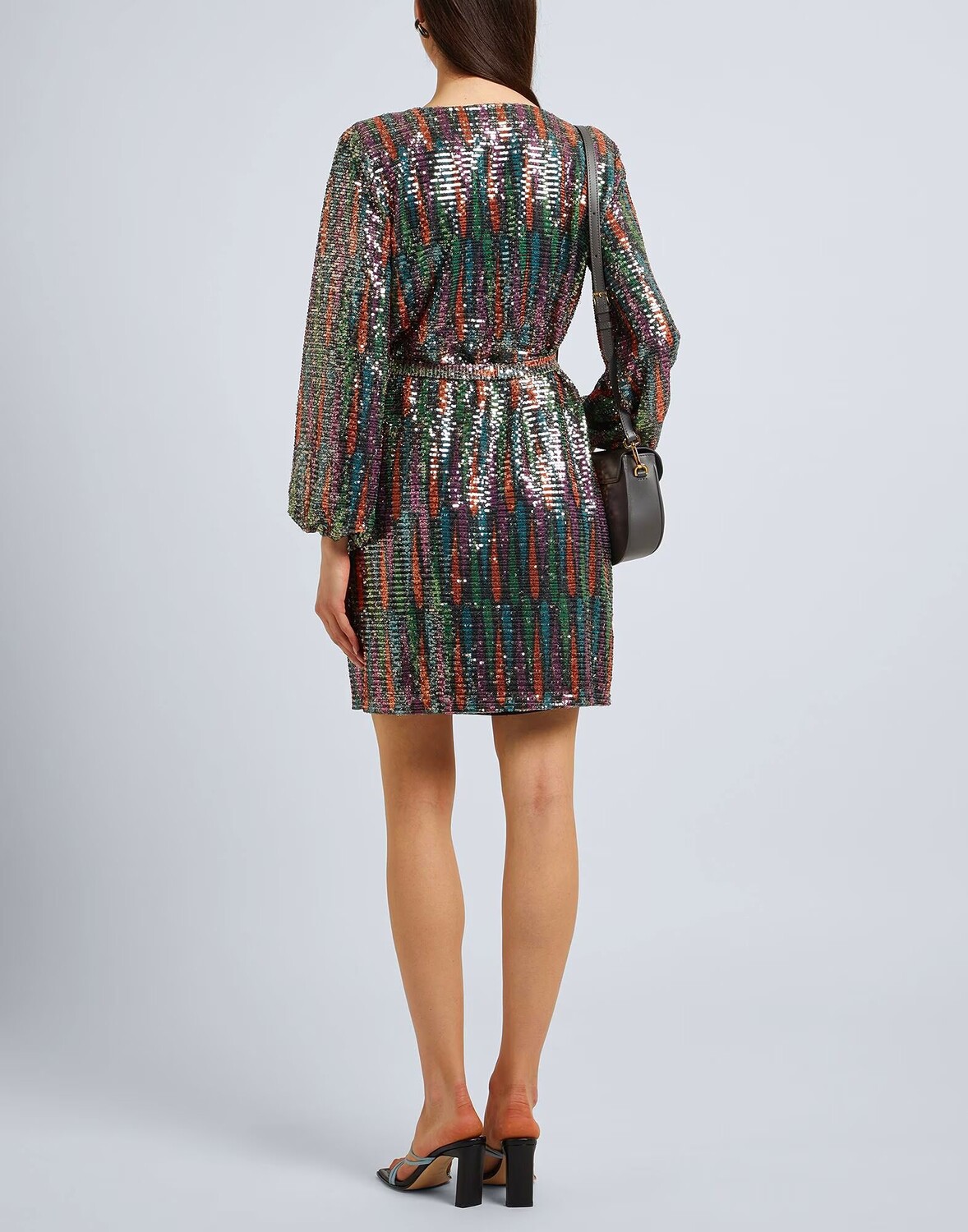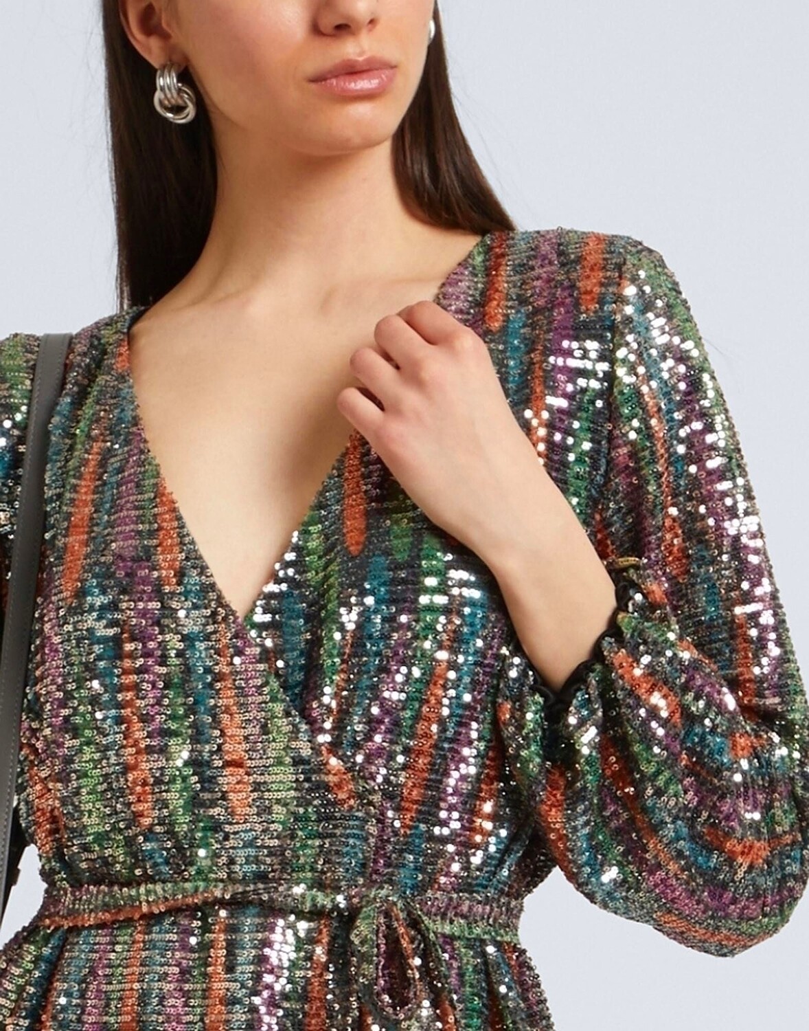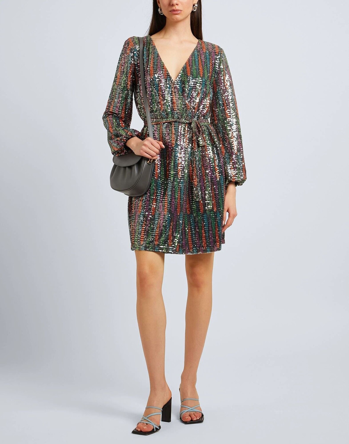 Тюль, пайетки, пояс, разноцветный, v-образный вырез, длинные рукава, подплечники, внутри на подкладке, кнопки, без карманов, стрейч, ручная стирка или химчистка, нельзя отбеливать, нельзя сушить в стиральной машине, платье с пайетками