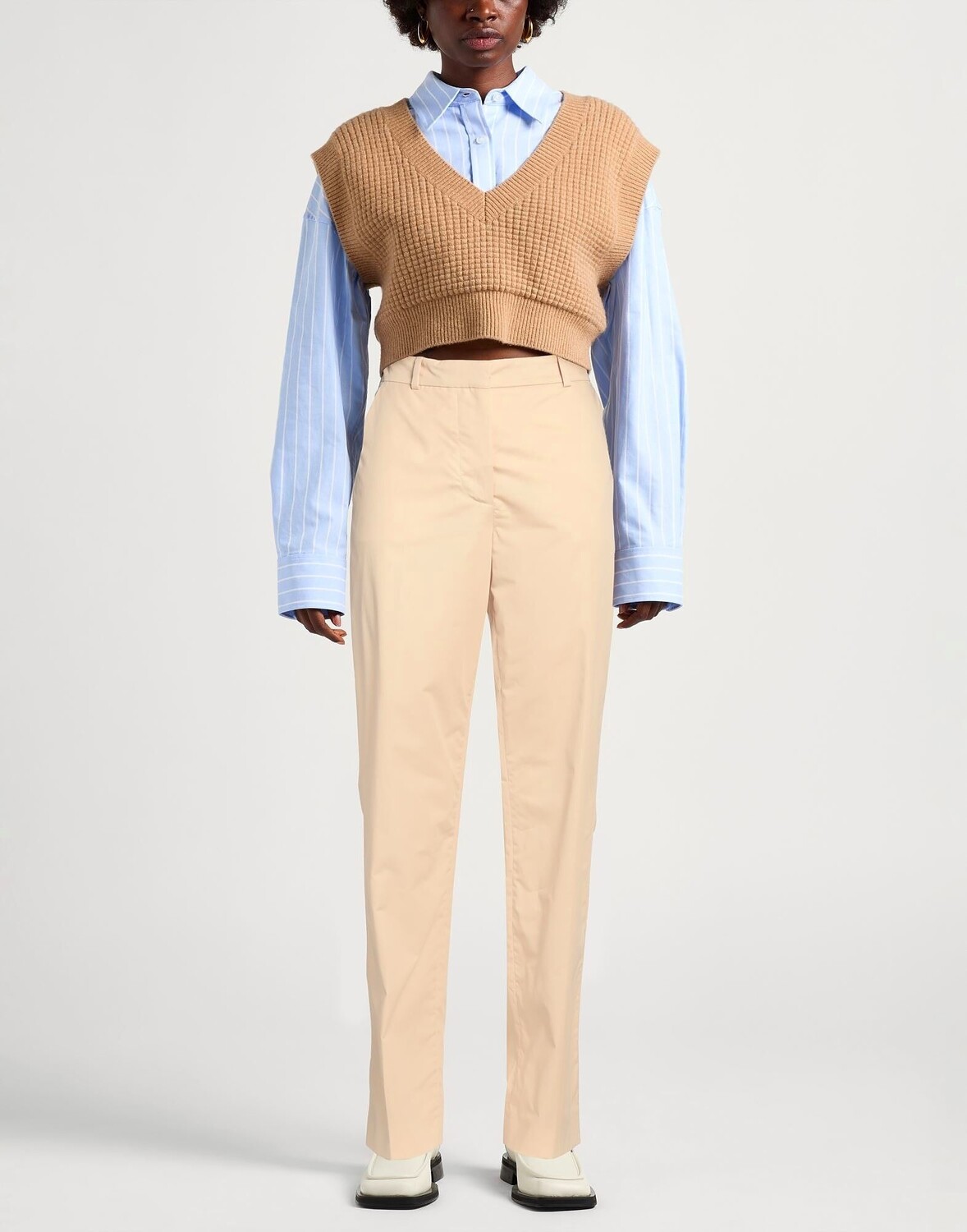 Брюки прямого кроя, ткань, логотип бренда, одноцветное изделие, завышенная талия, стандартная посадка, застежка на крючки, застежка-молния, множество карманов, ручная стирка, нельзя сушить в стиральной машине