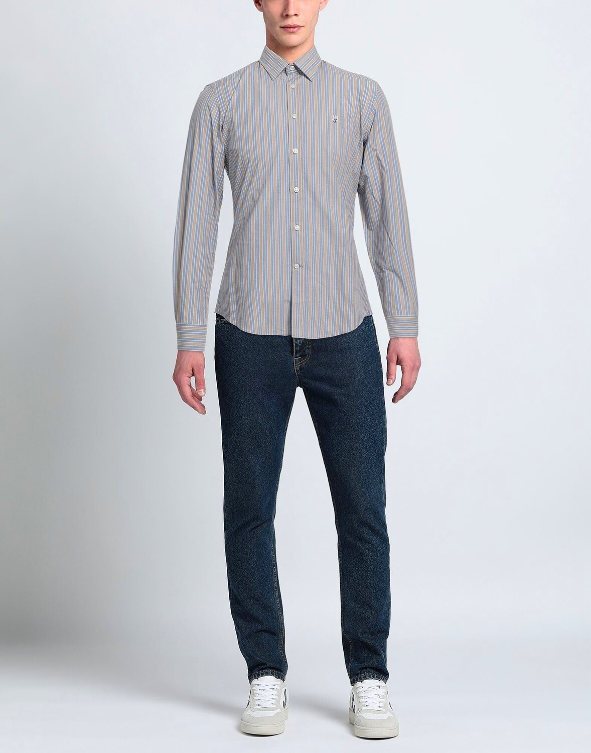 Тканый материал, логотип бренда, в полоску, классический воротник, длинные рукава, манжеты на пуговицах, застежка на пуговицы, без карманов, ручная стирка, нельзя сушить в стиральной машине, не отбеливать, рубашка приталенного кроя