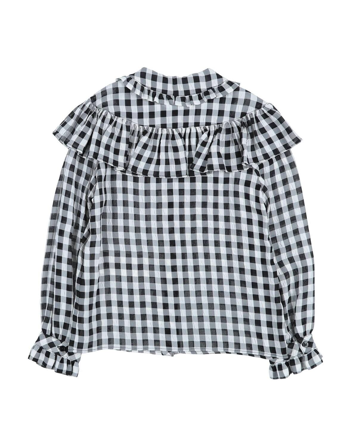 Креп, логотип бренда, складки, клетка в клетку, воротник «Питер Пэн», длинные рукава, манжеты на пуговицах, пуговицы, без карманов, нельзя стирать, химическая чистка с деликатными растворителями, не отбеливать, нельзя сушить в стиральной машине, гладить при температуре не выше 110°C