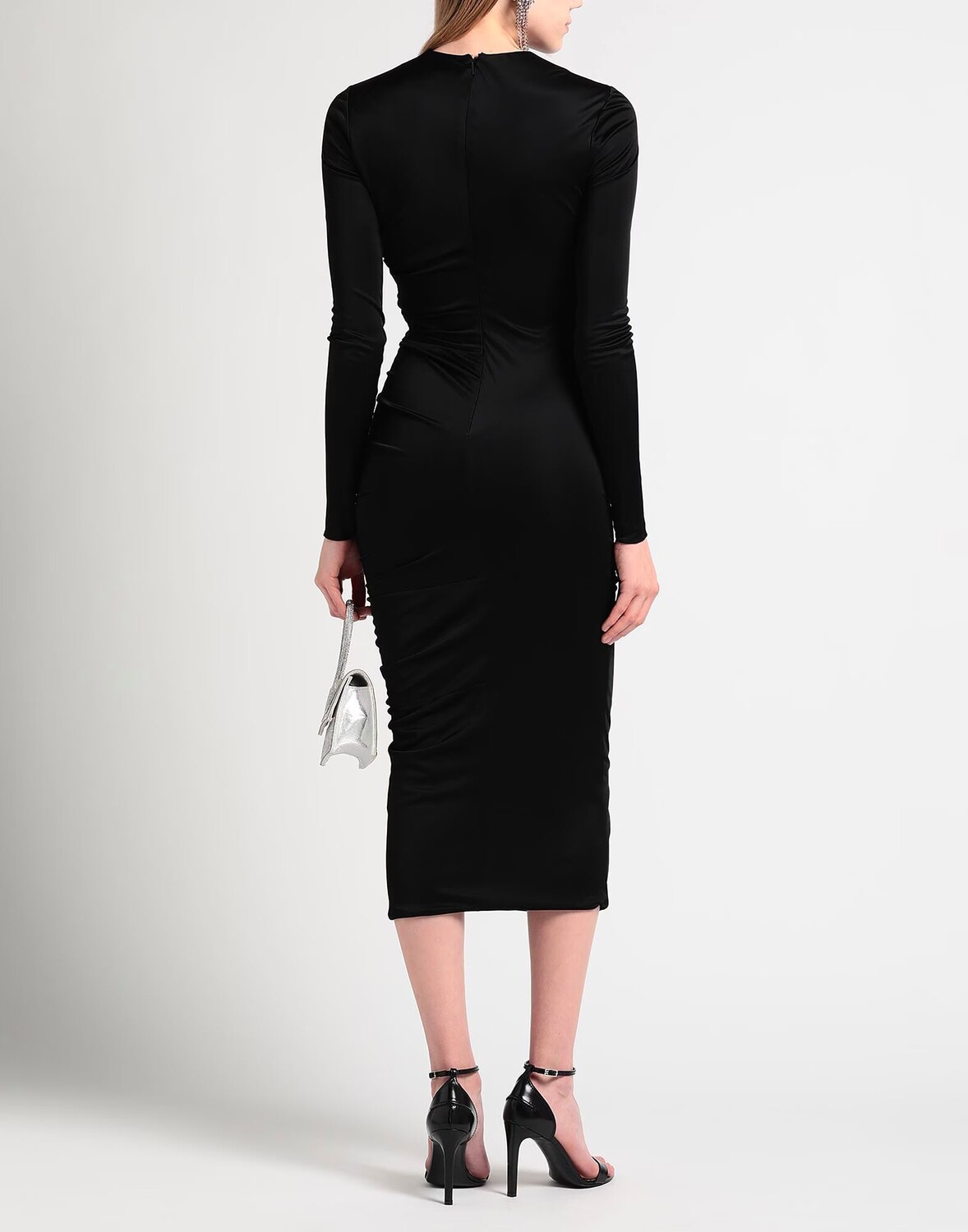 Синтетический трикотаж, присборки, одноцветное изделие, круглый вырез, длинные рукава, внутри на подкладке, застежка на крючки, застежка-молния, без карманов, химчистка, нельзя отбеливать, нельзя сушить в стиральной машине, нельзя гладить, облегающее платье