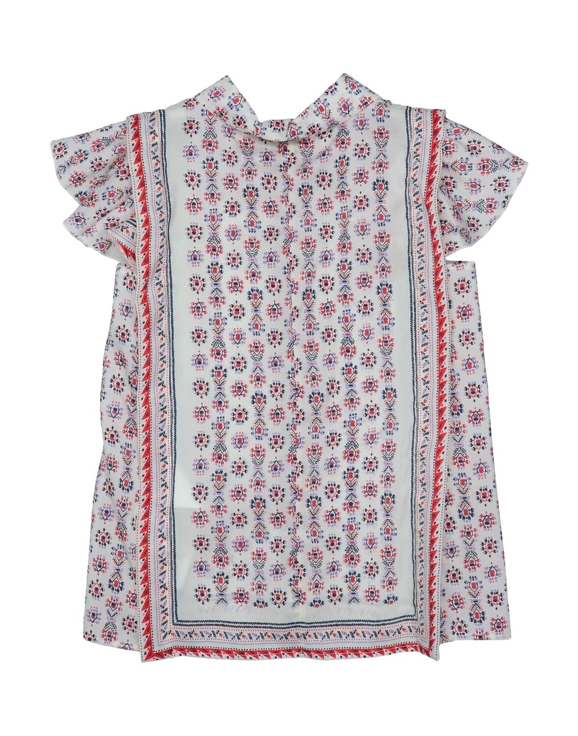 Атлас, оборки, цветочный дизайн, пуговицы, короткие рукава, классический вырез, без карманов, стирка при 30°C, химическая чистка, гладить при температуре не выше 110°C, нельзя отбеливать, нельзя сушить в стиральной машине