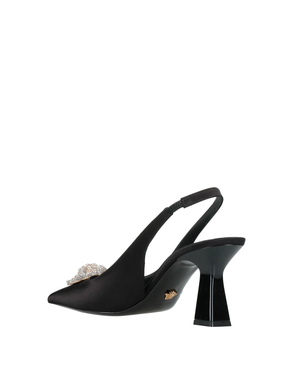 Атлас, кристаллы, декорирование, однотонное изделие с аппликациями, подкладка из кожи, эластичные вставки, острый носок, каблук-катушка, кожаная подошва, содержит нетекстильные части животного происхождения, туфли-лодочки с пяткой на пятке