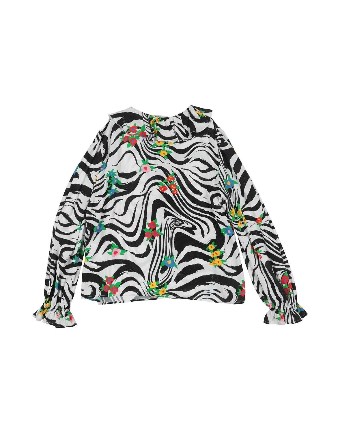 Креп, оборки, полоска «зебра», круглый вырез, длинные рукава, застежка на крючки, без карманов, не стирать, подлежит химчистке, не отбеливать, нельзя сушить в стиральной машине, гладить при температуре не выше 110°C