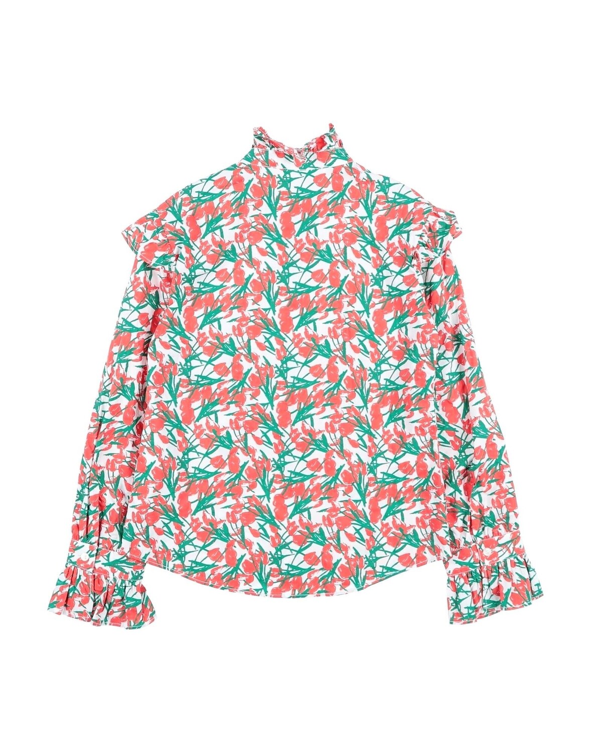 Полотняное переплетение, оборки, цветочный принт, водолазка, длинные рукава, манжеты на пуговицах, пуговицы, без карманов, ручная стирка, химическая чистка, нельзя отбеливать, нельзя сушить в стиральной машине, гладить при температуре не выше 110°C