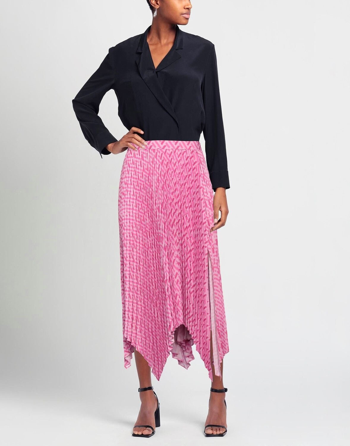 Креп, складки, логотип, средняя посадка, стандартный крой, без подкладки, застежка-молния, боковой разрез, асимметричный низ, без карманов, плиссированная модель