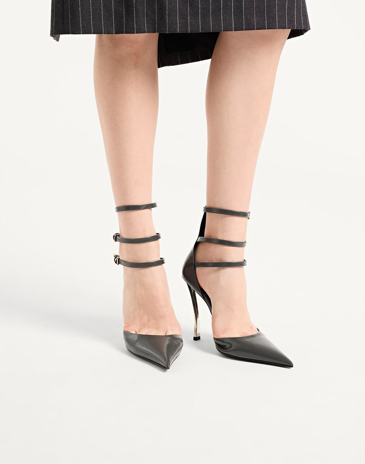 Кожа, полированная кожа, без аппликаций, одноцветное изделие, кожаная подкладка, застежка на бретельках, узкий носок, скульптурный каблук, кожаная подошва, содержит нетекстильные части животного происхождения, туфли с ремешком на щиколотке