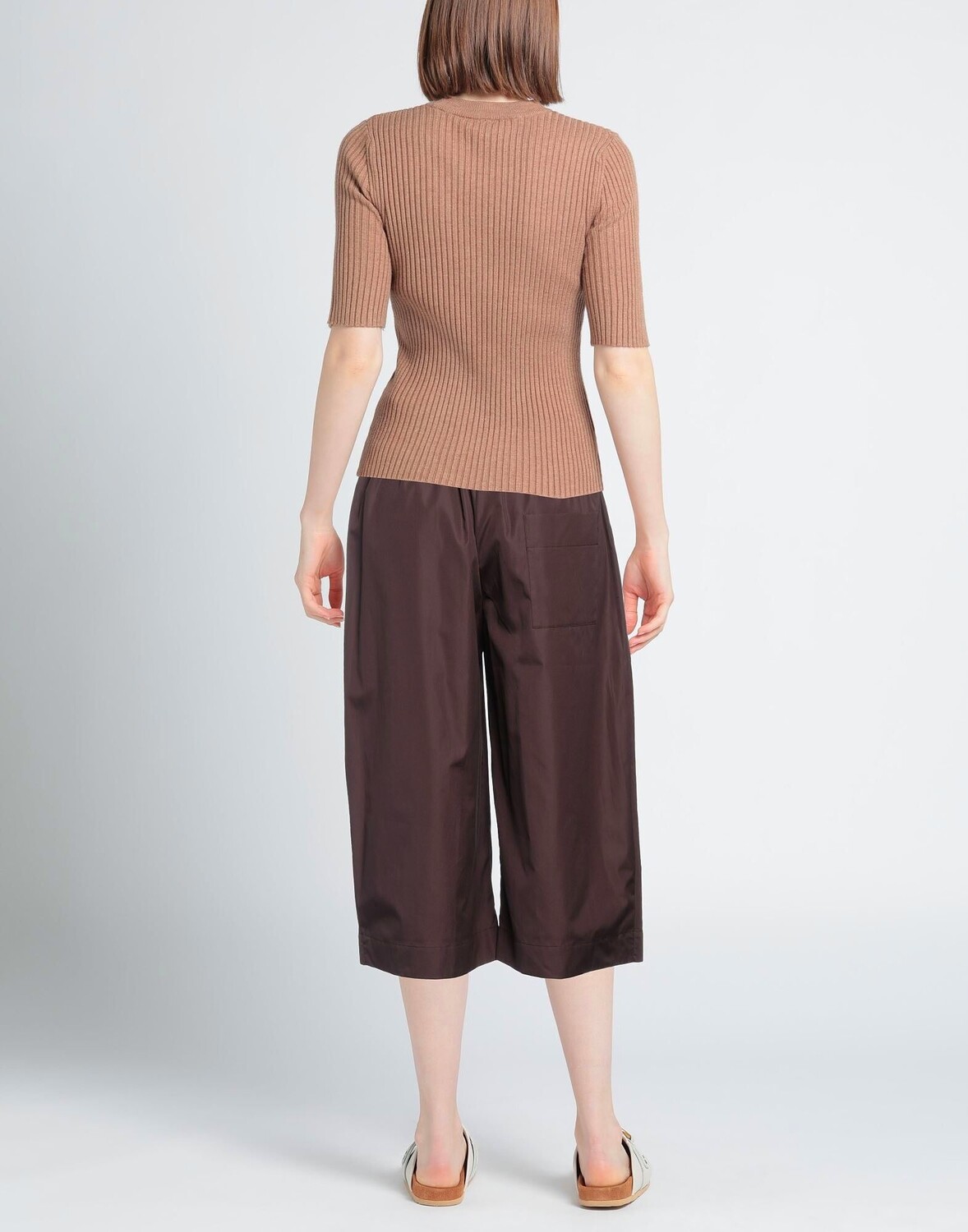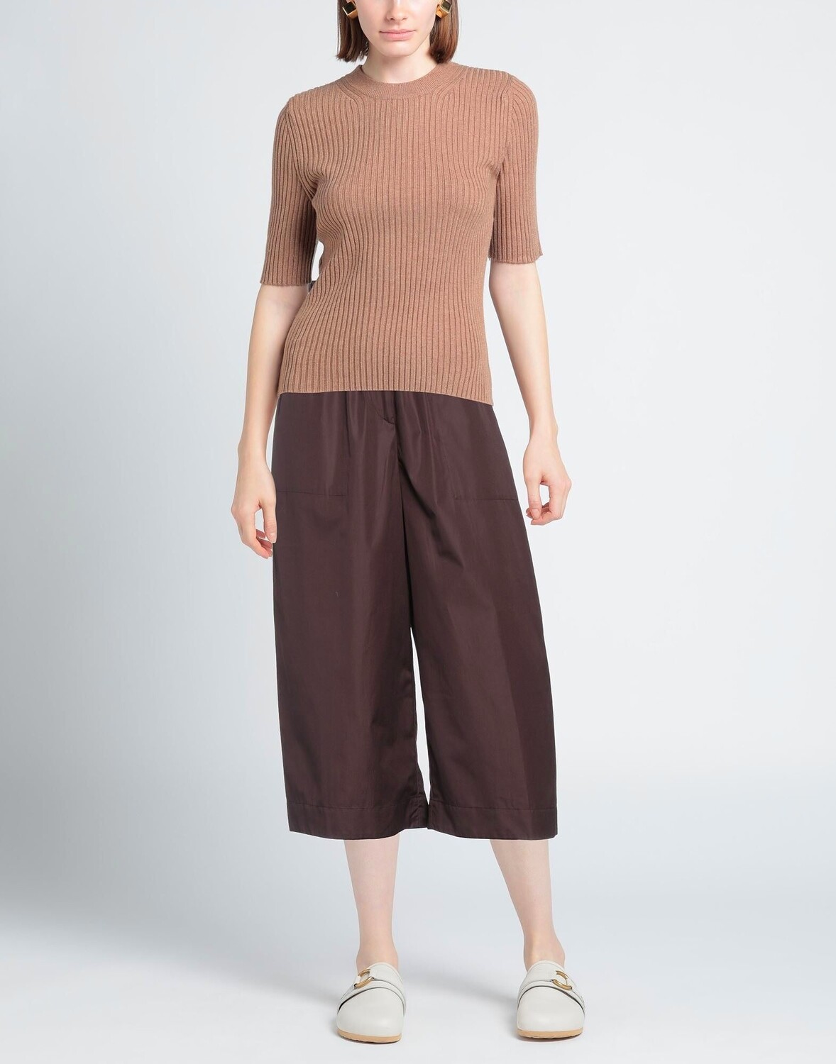 Ткань, без аппликаций, одноцветное изделие, завышенная талия, резинка на талии, свободный крой, 1 пуговица, застежка-молния, множество карманов, машинная стирка, нельзя отбеливать, нельзя сушить в стиральной машине, укороченная модель, брюки-кюлоты