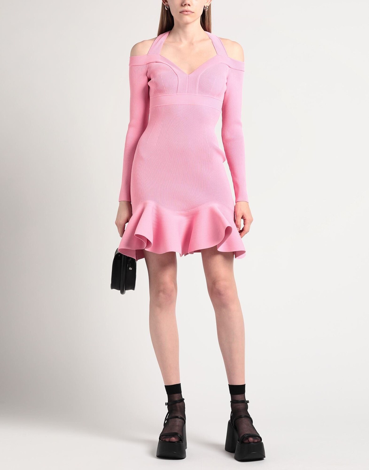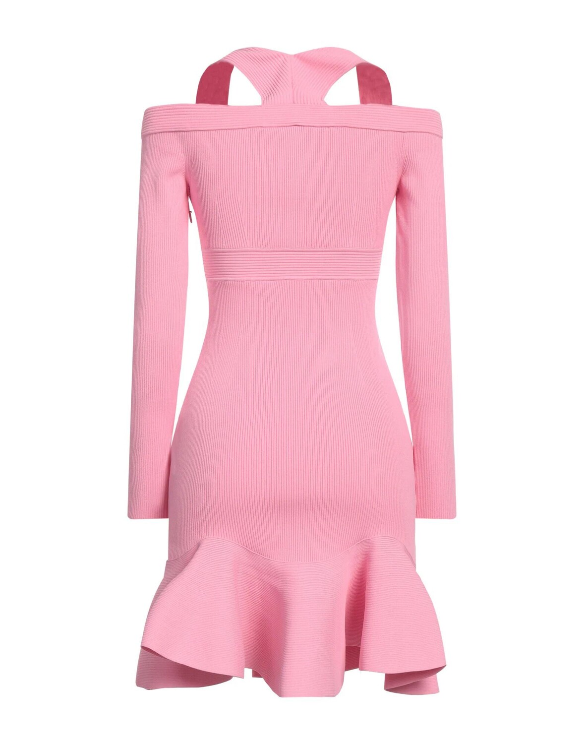 Трикотажное изделие, в рубчик, легкая вязка, без аппликаций, одноцветное изделие, v-образный вырез, длинные рукава, без подкладки, застежка-молния, без карманов, оборка по низу, химчистка, нельзя сушить в стиральной машине, не отбеливать, облегающее платье