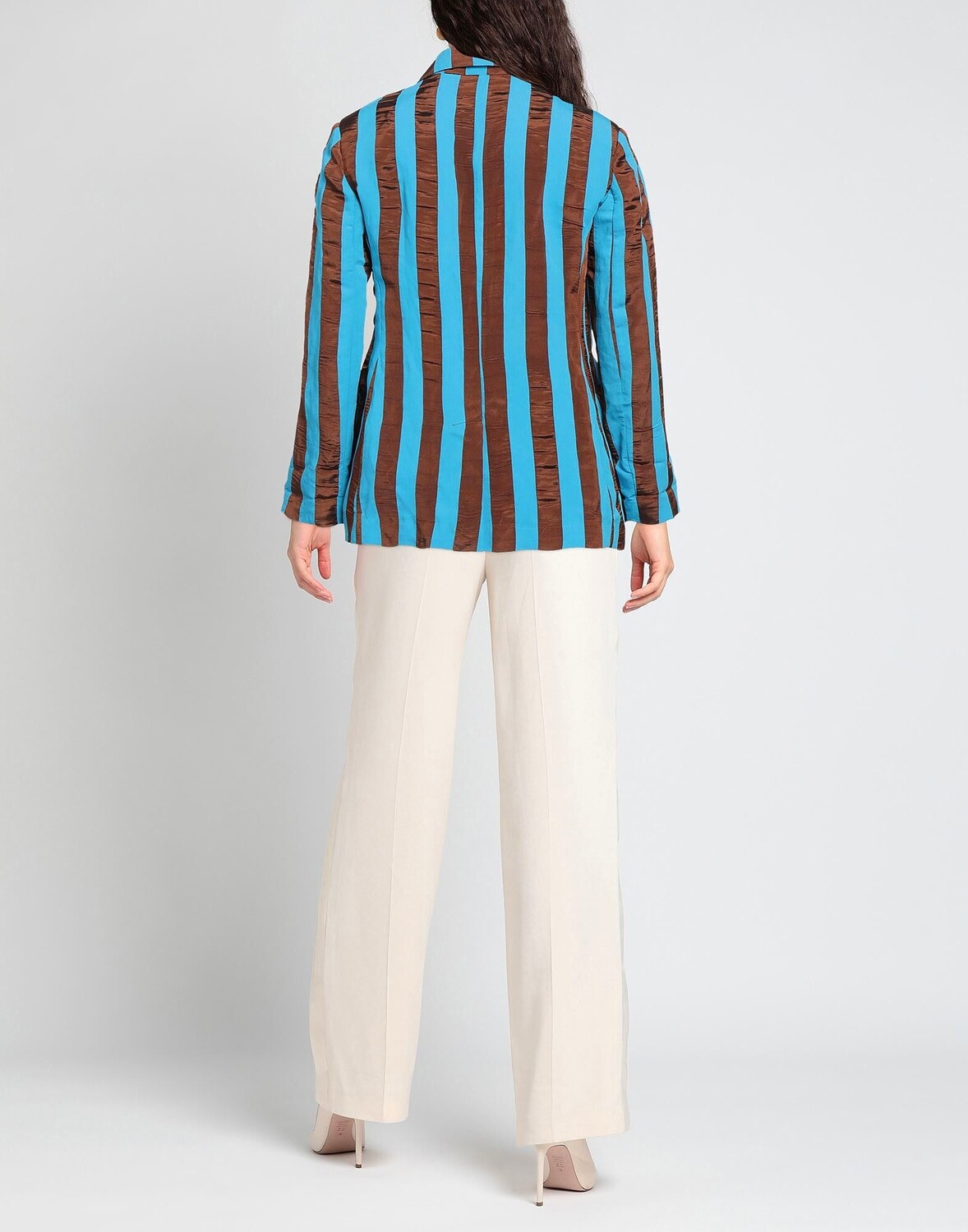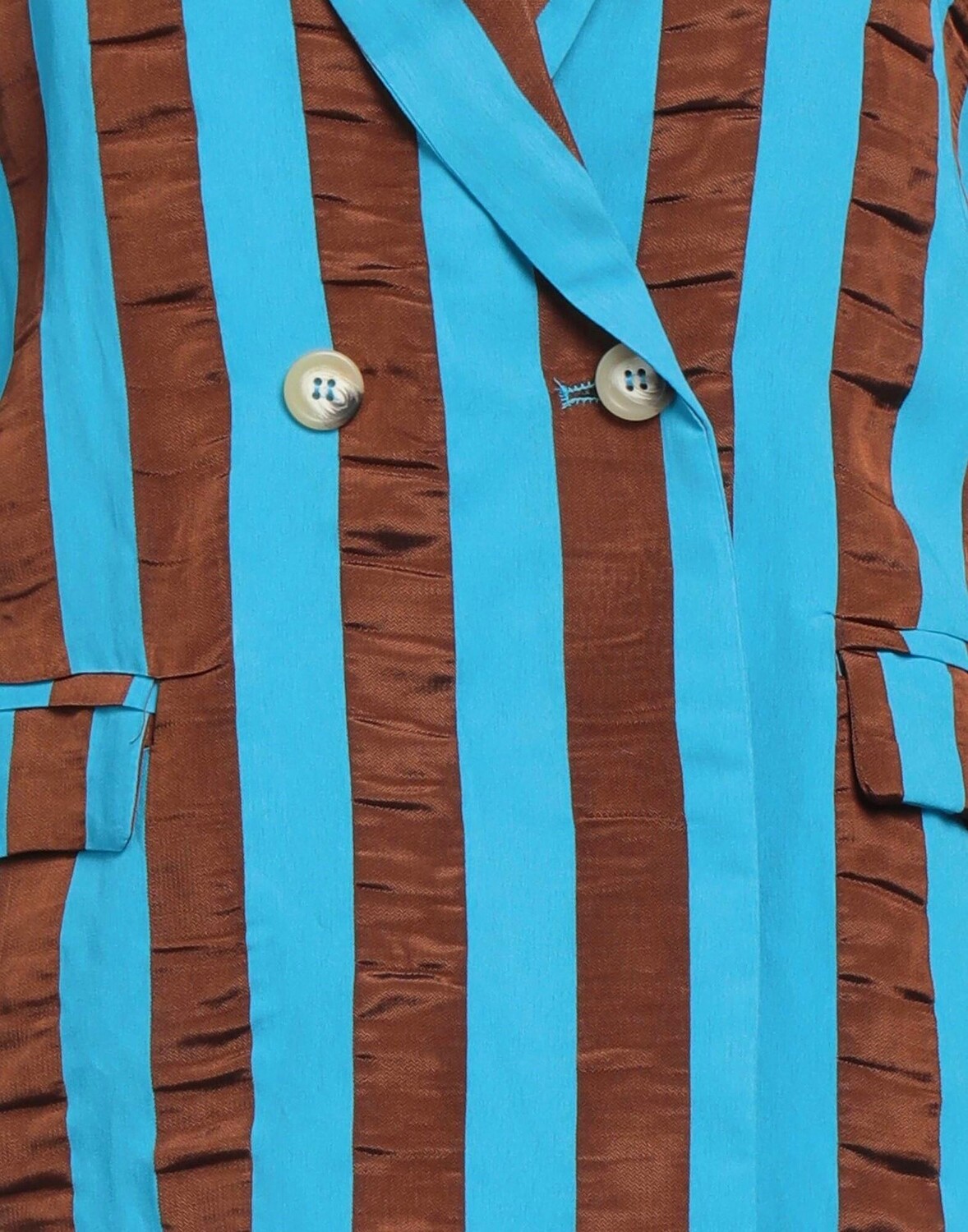 Полотняное переплетение, без аппликаций, в полоску, двухцветное, воротник с лацканами, двубортный, длинные рукава, полностью на подкладке, пуговицы, множество карманов, карман с клапаном, разрез сзади, двубортный пиджак