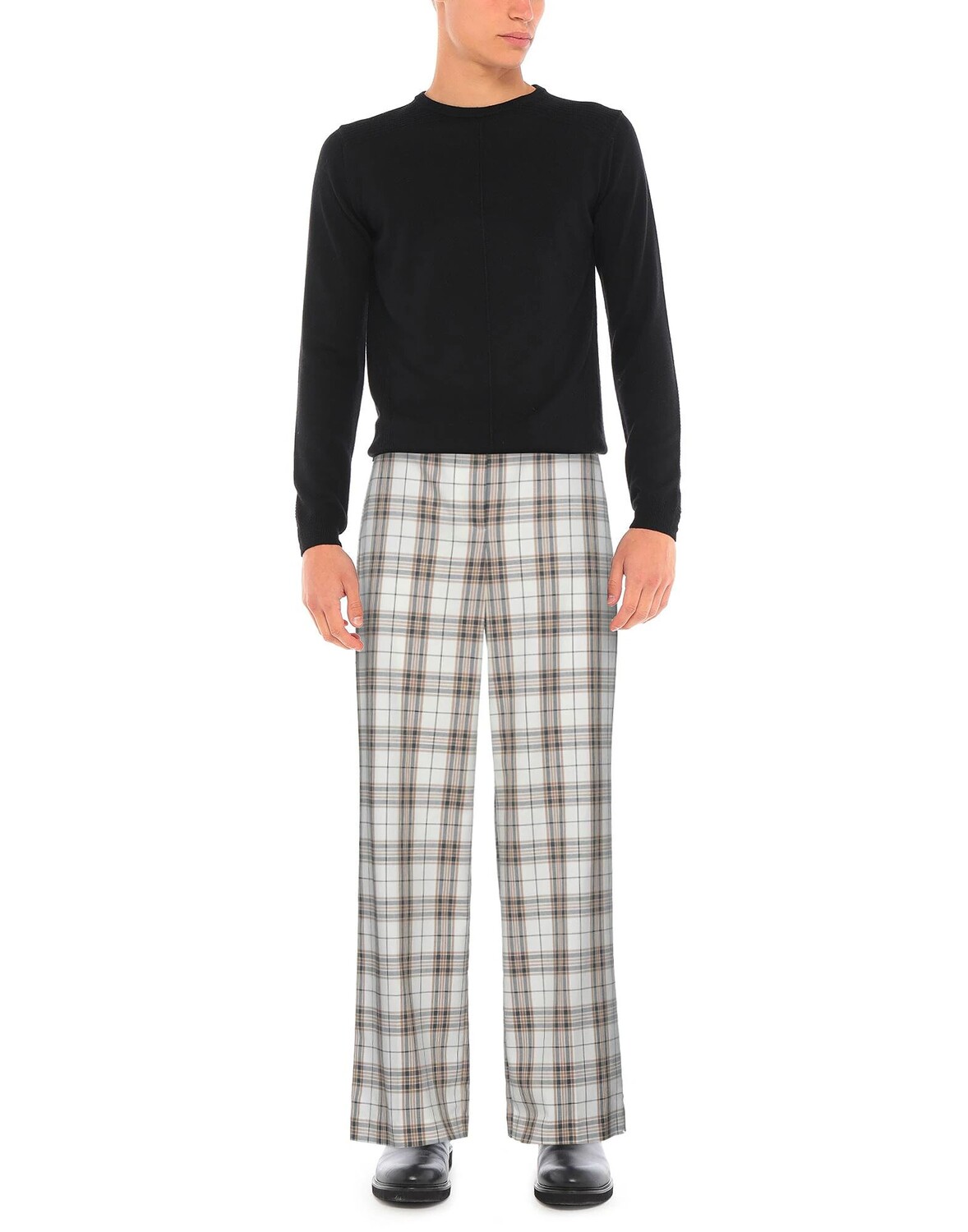 Полотняное переплетение, пояс, узор в клетку «шотландка», завышенная талия, широкие брючины, стандартный крой, застежка на крючки, застежка-молния, множество карманов, стрейч