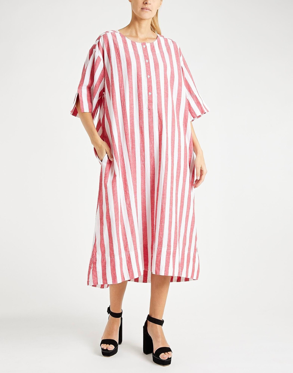 Полотняное переплетение, без аппликаций, в полоску, круглый воротник, короткие рукава, без подкладки, пуговицы, множество карманов, платье