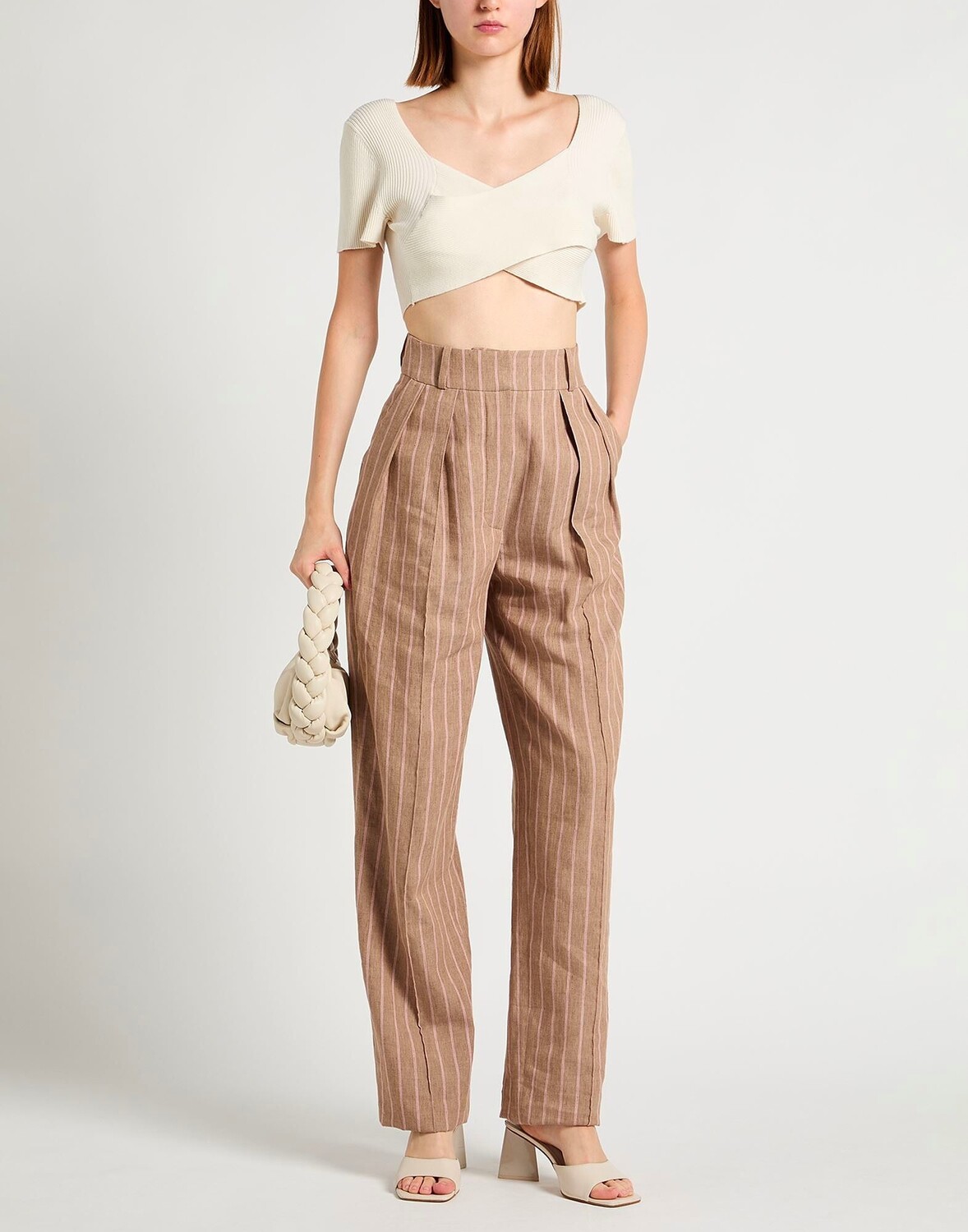 Лен, вытачки, в полоску, завышенная талия, шлевки для ремня, стандартный крой, застежка-молния, застежка на крючки, множество карманов, химчистка, нельзя отбеливать, нельзя сушить в стиральной машине, нельзя гладить, брюки прямого кроя