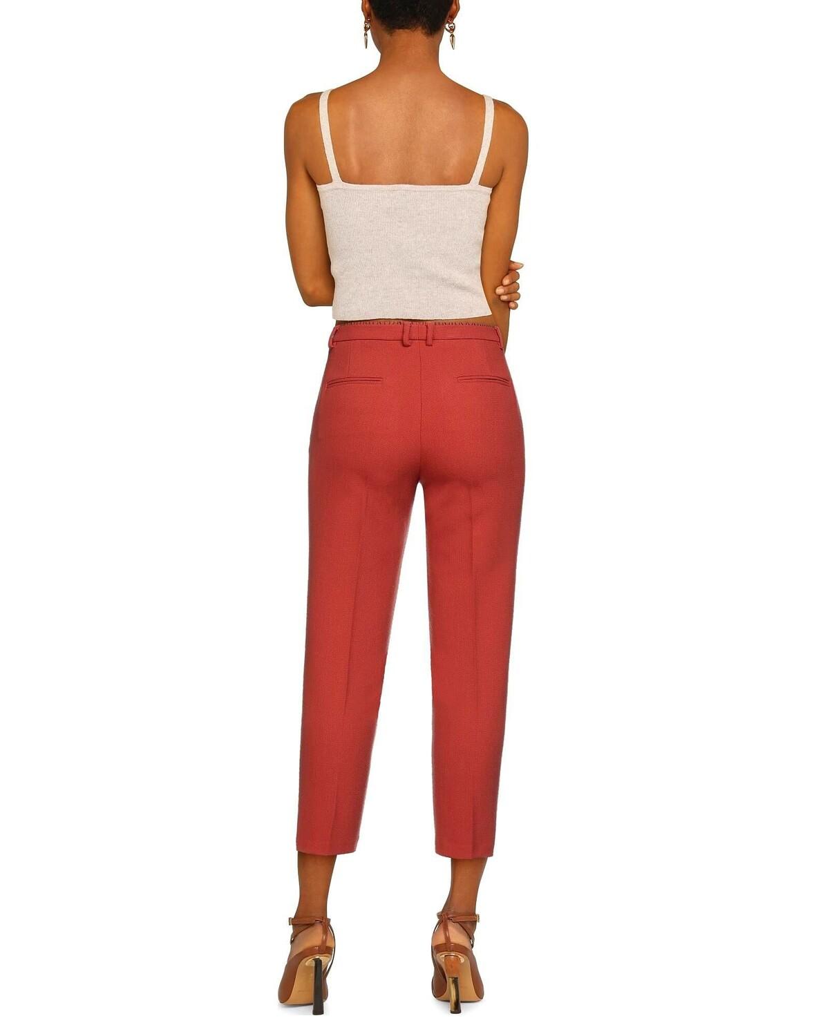 Тканый материал, без аппликаций, одноцветное изделие, высокая талия, шлевки для ремня, приталенный крой, множество карманов, эластичный, содержит нетекстильные части животного происхождения, брюки этой марки небольшого размера, зауженные книзу