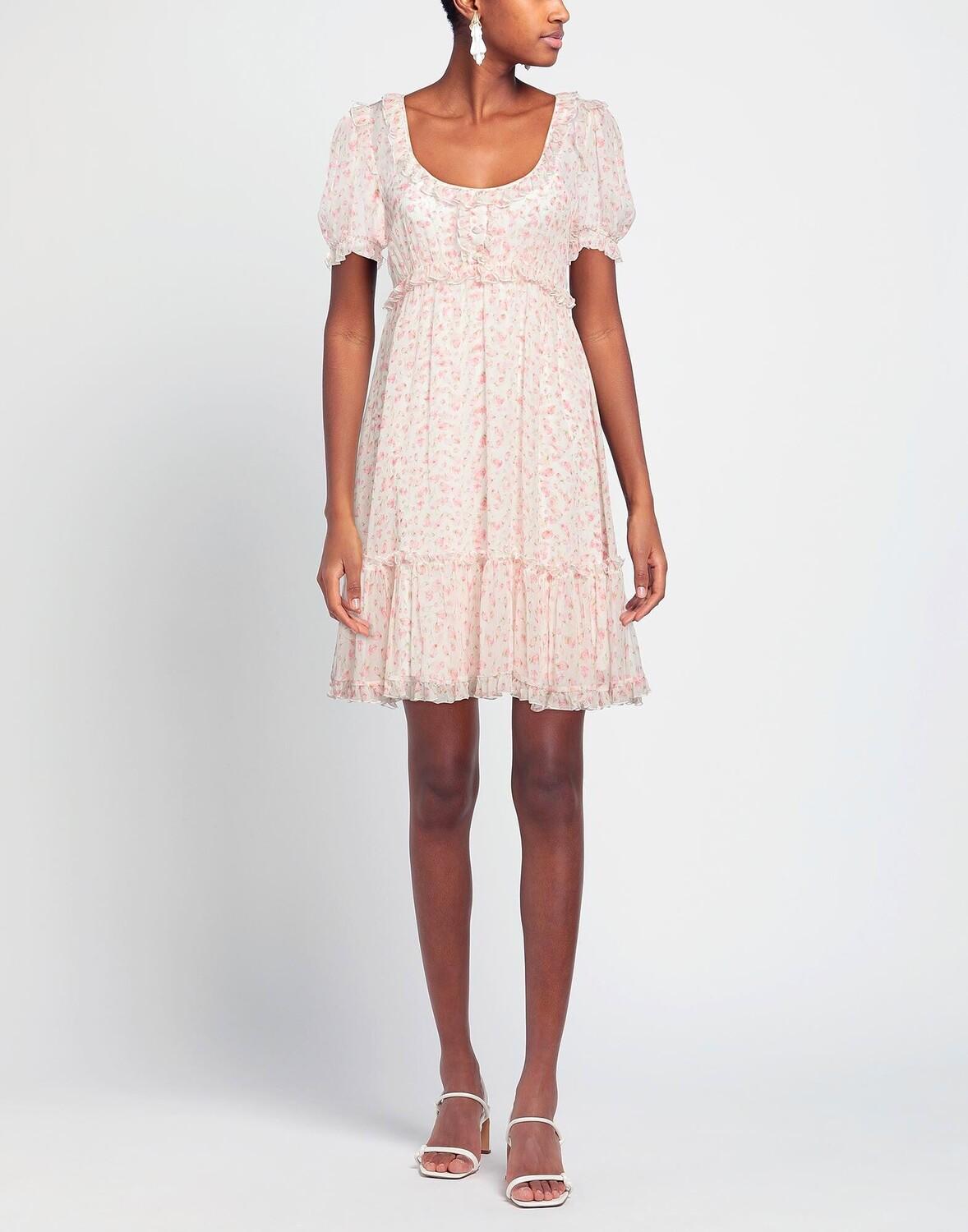 Шифон, оборки, цветочный дизайн, круглый воротник, короткие рукава, скользящий силуэт, без карманов, стрейч, фасон трапеция
