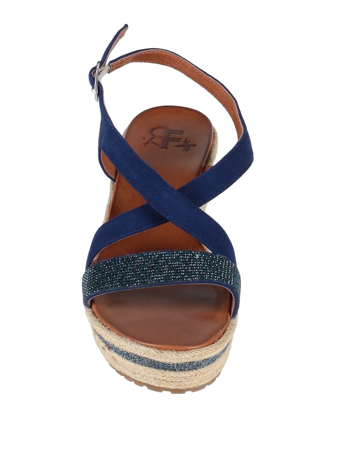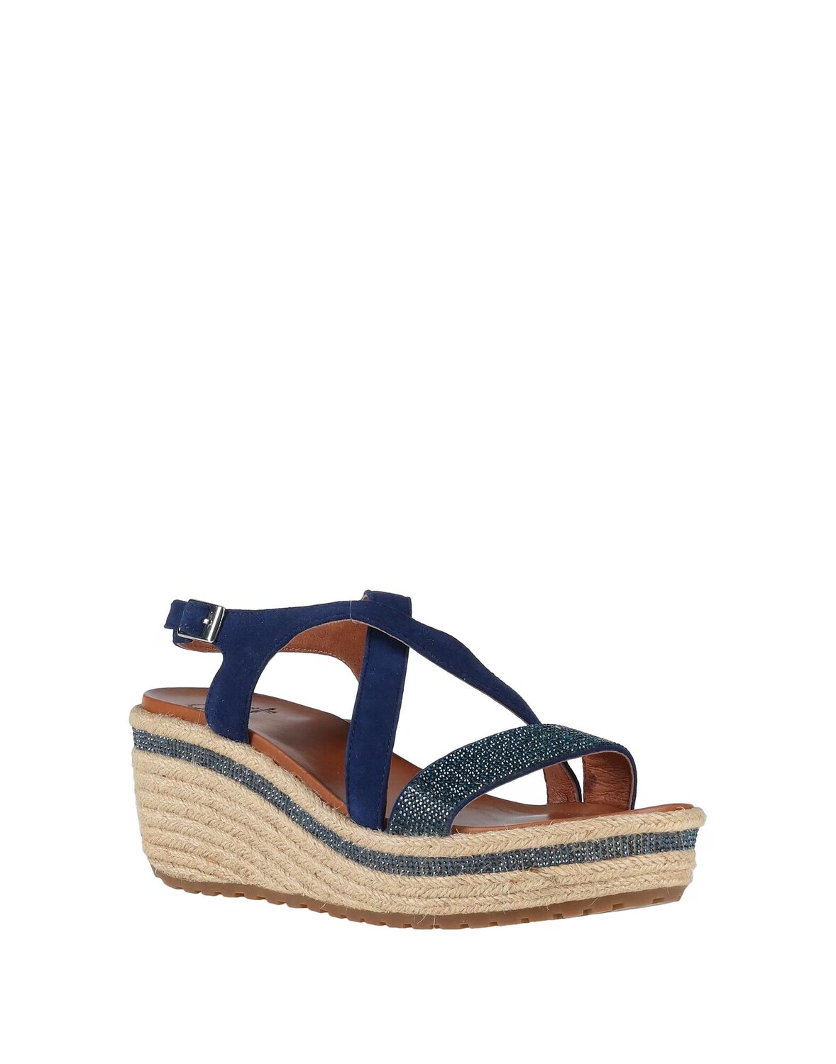 Замша, кристаллы, одноцветное изделие с аппликациями, подкладка из кожи, застежка на пряжке, круглый носок, танкетка, верёвочная танкетка, резиновая подошва с тиснением, содержит нетекстильные части животного происхождения, сандалии-эспадрилья