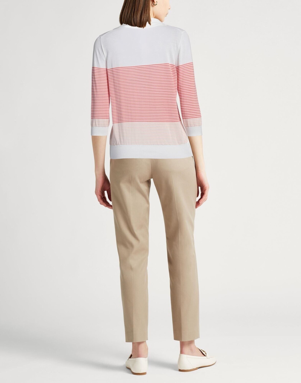 Трикотаж, легкая вязка, без аппликаций, в полоску, воротник-поло, рукава 3/4, без карманов, ручная стирка или химчистка, не отбеливать, нельзя сушить в стиральной машине