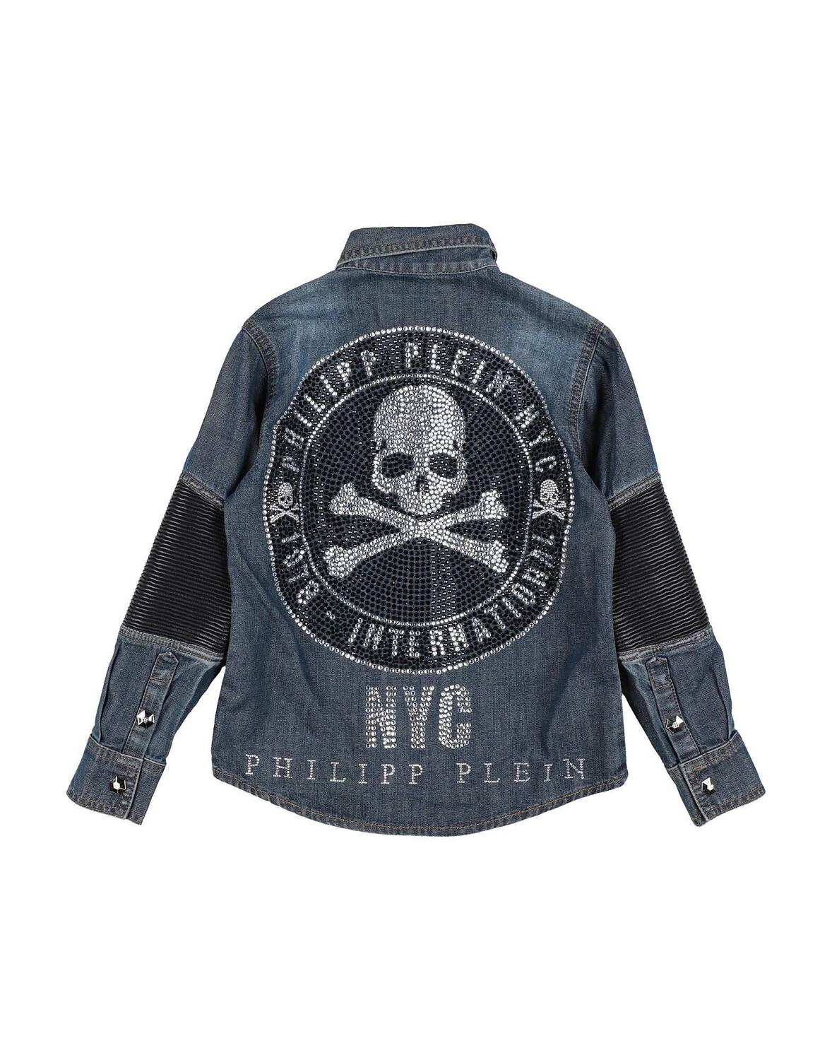 Ткань с покрытием, деним, меланж, стразы, логотип бренда, двухцветный вариант, темная стирка, классический вырез горловины, длинные рукава, манжеты на кнопках, застежка на кнопки, один нагрудный карман, не стирать, не подвергать химчистке, не отбеливать, не сушить в стиральной машине, не гладить