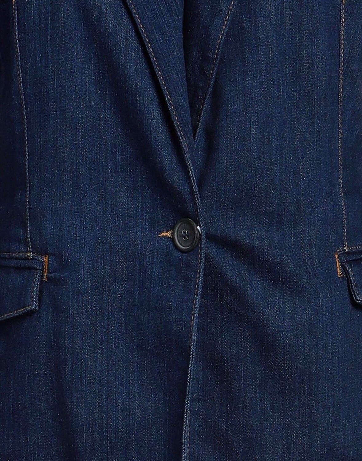 Джинсовая ткань, логотип бренда, одноцветное изделие, средняя стирка, воротник с лацканами, длинные рукава, без подкладки, 1 пуговица, множество карманов, машинная стирка, нельзя отбеливать, нельзя сушить в стиральной машине, однобортный пиджак