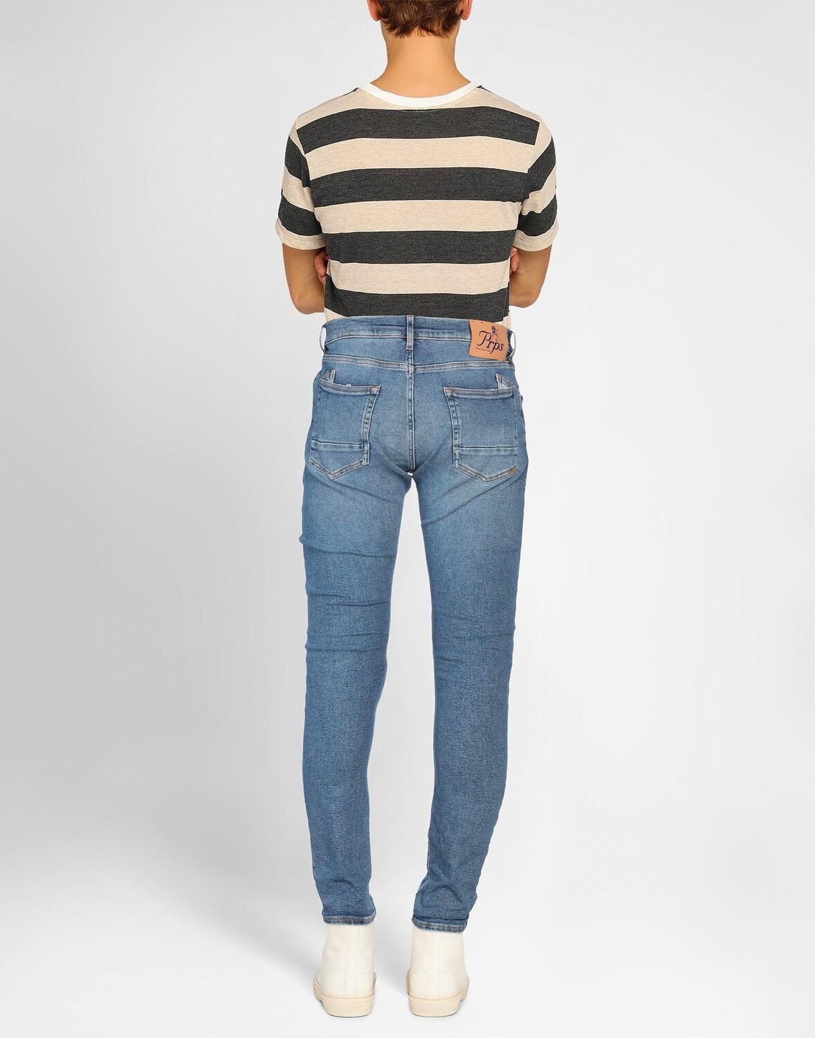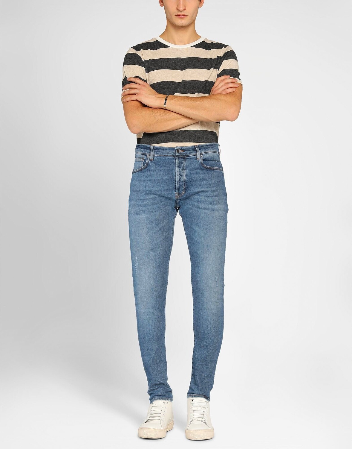 Деним, выцветший, эффект потертости, логотип бренда, кожаные аппликации, одноцветное изделие, средняя потертость, средняя посадка, шлевки для ремня, прямые брюки, узкие брюки, пуговицы, множество карманов, стрейч, содержит нетекстильные части животного происхождения, скинни модель, большой размер