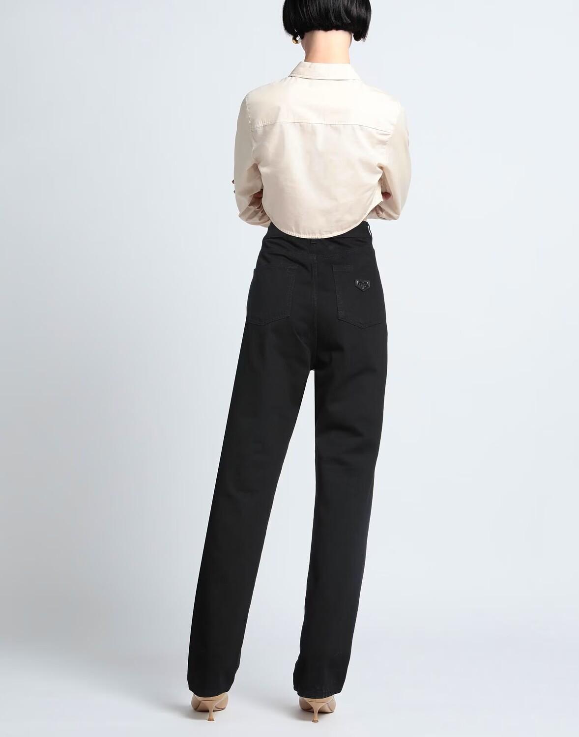 Джинсовая ткань, логотип бренда, кожаные аппликации, одноцветное изделие с аппликациями, цветная расцветка, завышенная талия, прямые брючины, удобная посадка, застежка-молния, 1 пуговица, пять карманов, содержит нетекстильные части животного происхождения, модель прямого кроя