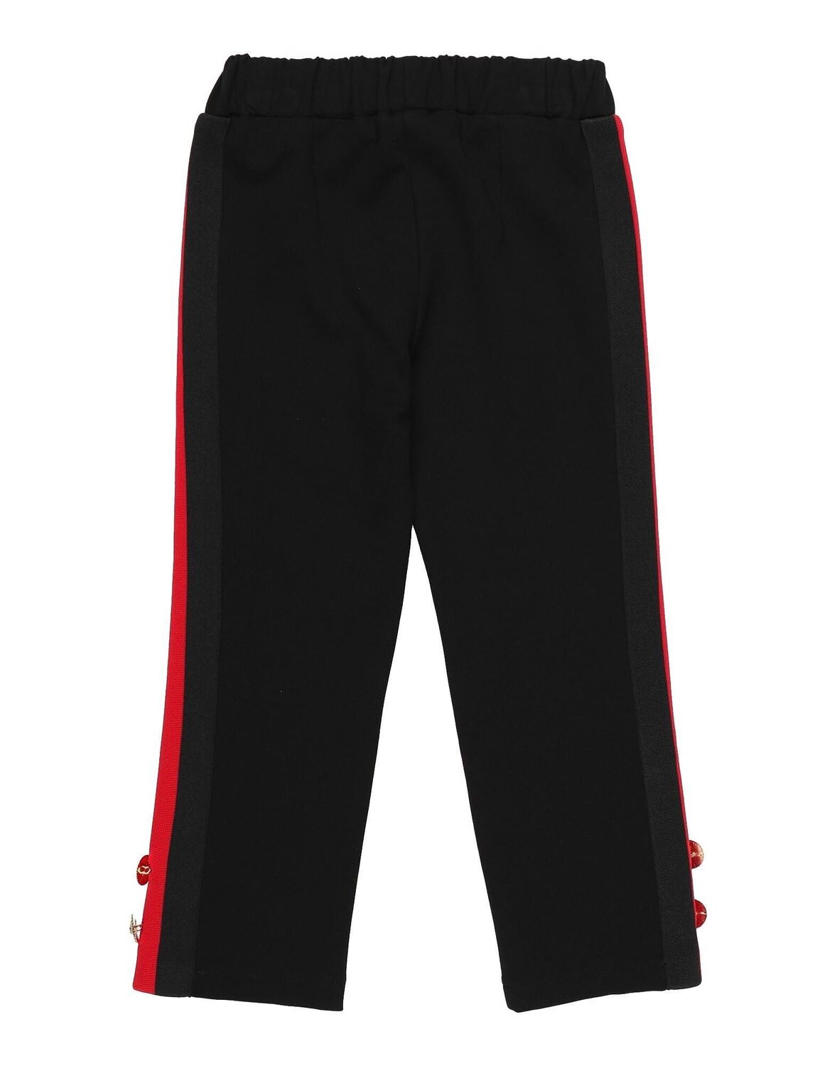 Джерси, полоски по бокам, контрастные аппликации, одноцветное изделие с аппликациями, множество карманов, стрейч, стирка при 30°C, химическая чистка, нельзя отбеливать, сушить в стиральной машине, гладить при температуре не выше 110°C, брюки
