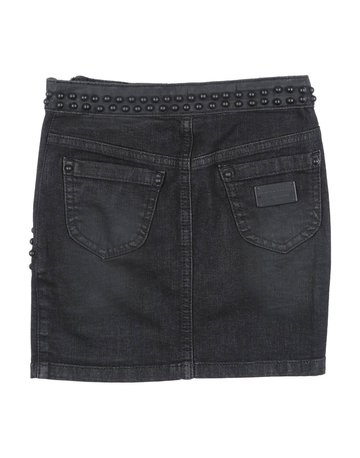 Джинсовая ткань, металлические аппликации, логотип бренда, одноцветное изделие, цветная стирка, застежка-молния, множество карманов, тянется, не стирать, не подвергать химчистке, не отбеливать, нельзя сушить в стиральной машине, нельзя гладить, юбка