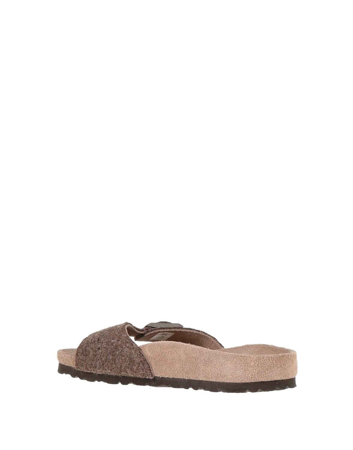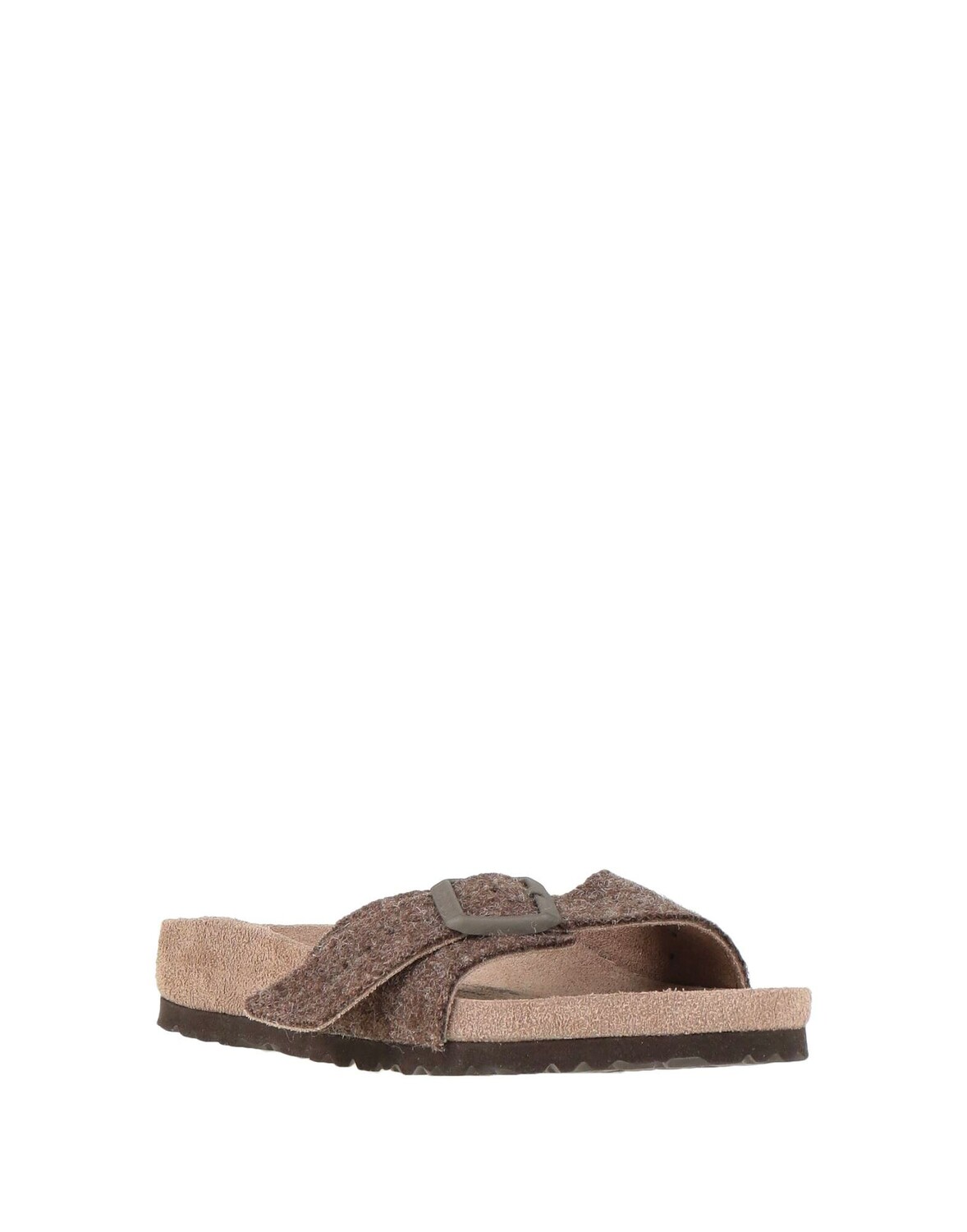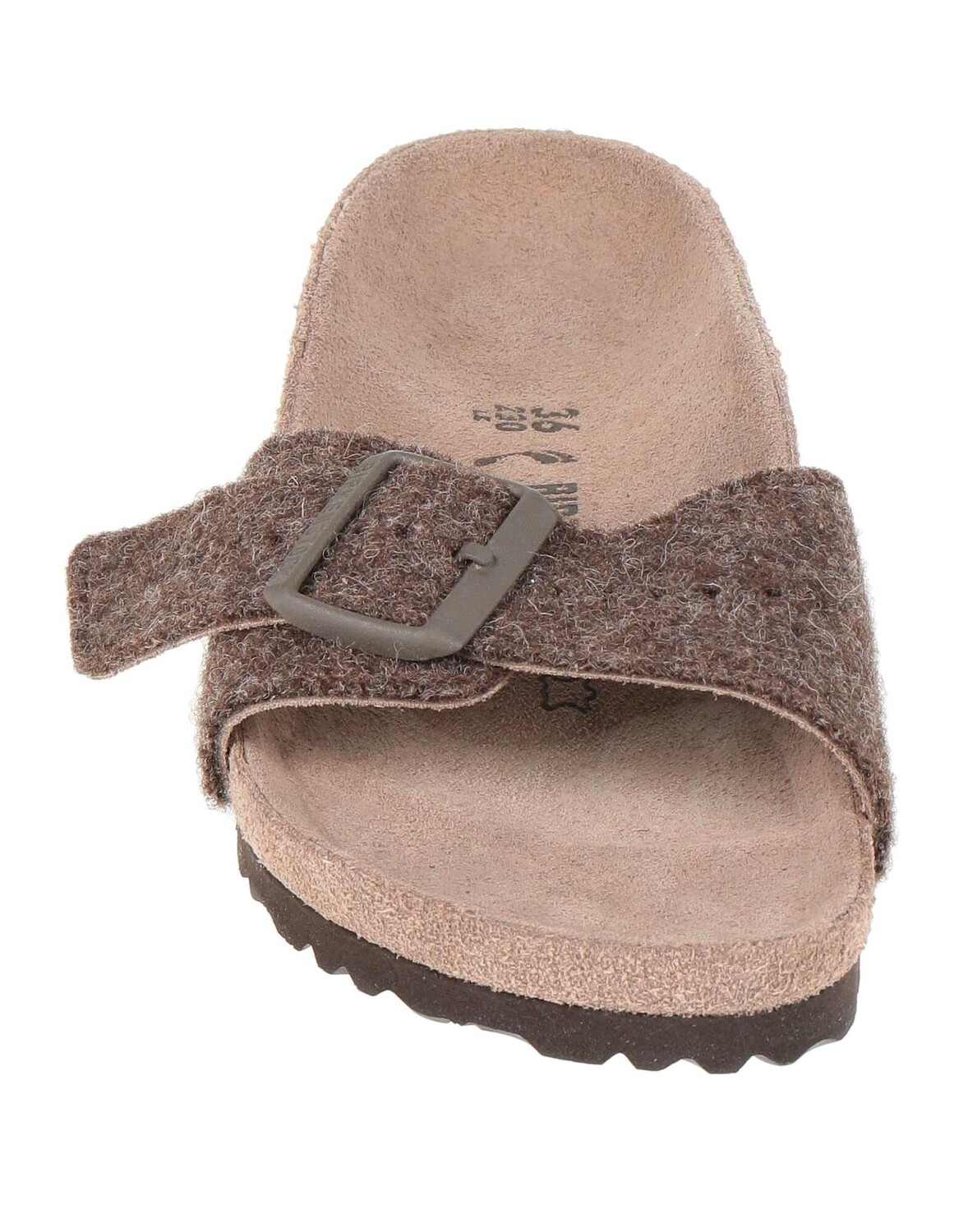 Вареная шерсть, логотип бренда, одноцветное изделие, подкладка из кожи, застежка на пряжку, скругленный носок, без каблука, резиновая подошва, содержит нетекстильные части животного происхождения, стелька: узкая, шлепанцы