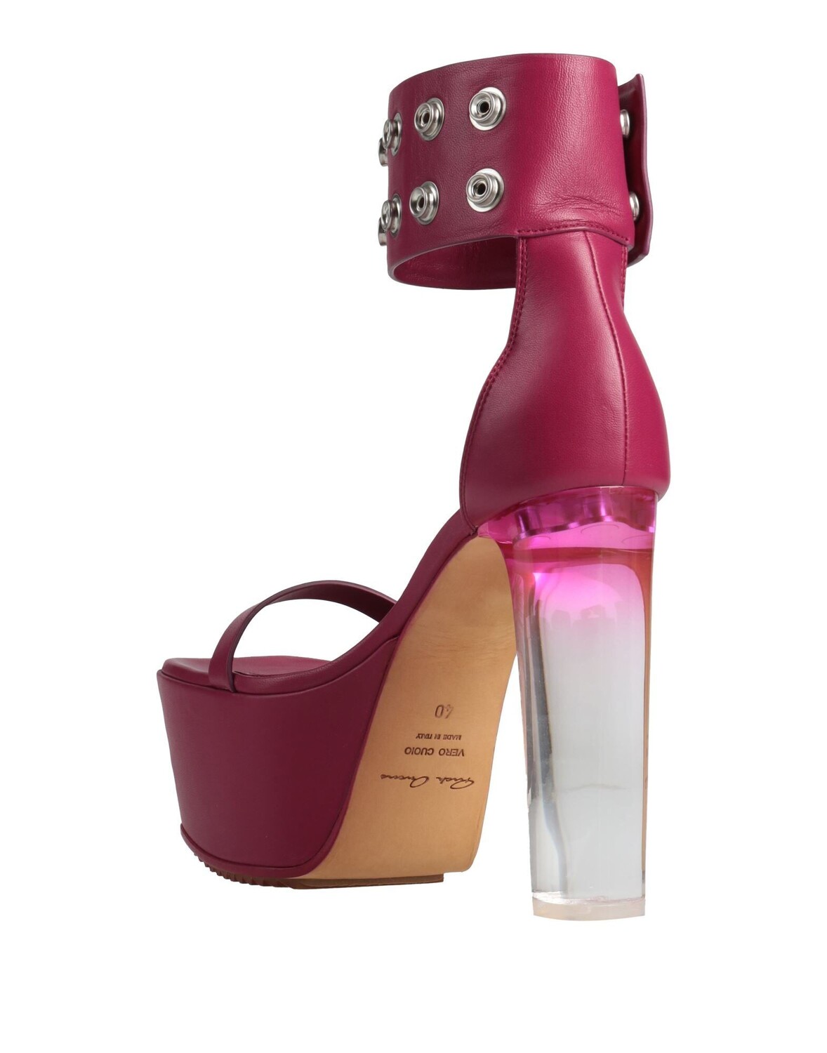 Босоножки с ремешком на щиколотке, кожа, заклепки, одноцветное изделие с аппликациями, подкладка из кожи, кнопки, квадратный носок, каблук-шпилька, акриловый каблук, резиновая подошва с тиснением, содержит нетекстильные части животного происхождения