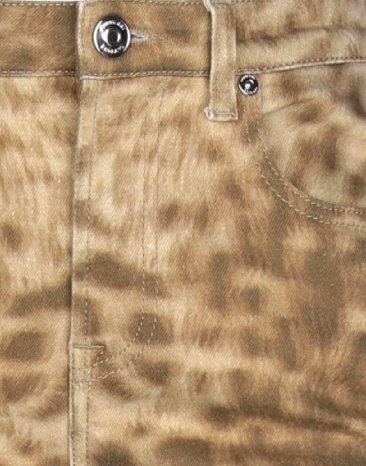 Содержит нетекстильные части животного происхождения, джинсовая ткань, логотип, леопардовый принт, цветная стирка, средняя посадка, застежка спереди, пуговица, молния, множество карманов, стрейч