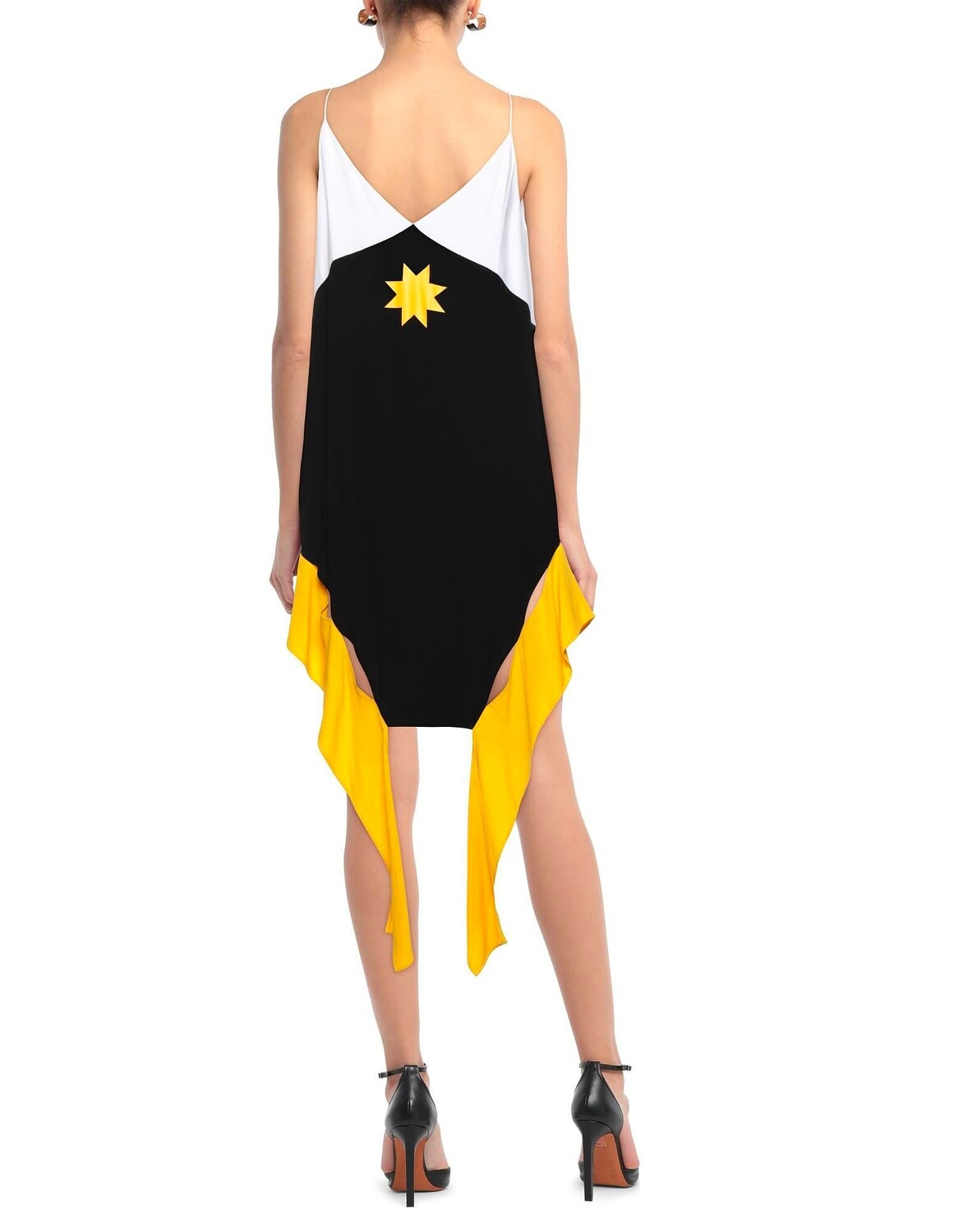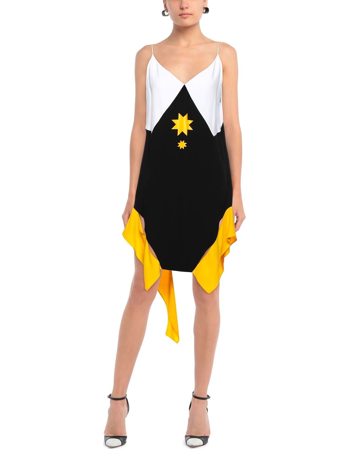Креп, принт, разноцветный, V-образный вырез, без рукавов, без подкладки, застежка-молния, без карманов, асимметричный низ, асимметричное платье
