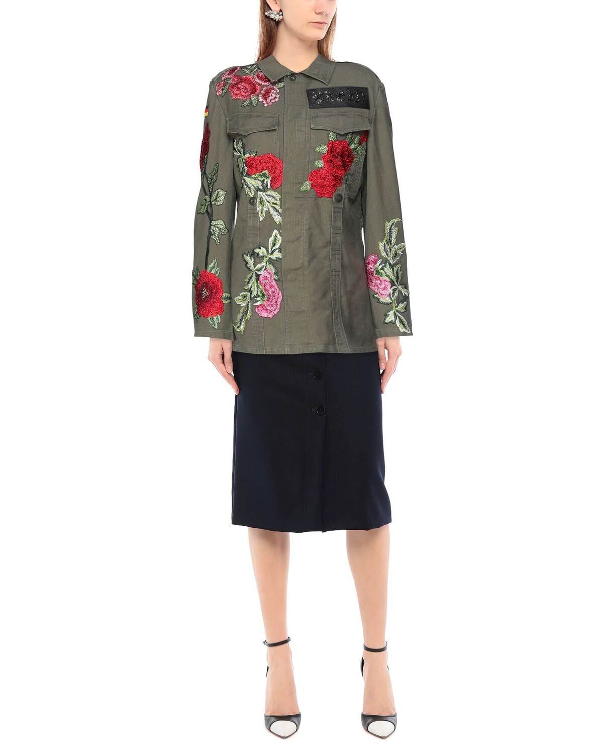 Полотняное плетение, стразы, логотип бренда, цветочный дизайн, однобортный, классический вырез горловины, длинные рукава, пуговицы, два кармана, без подкладки