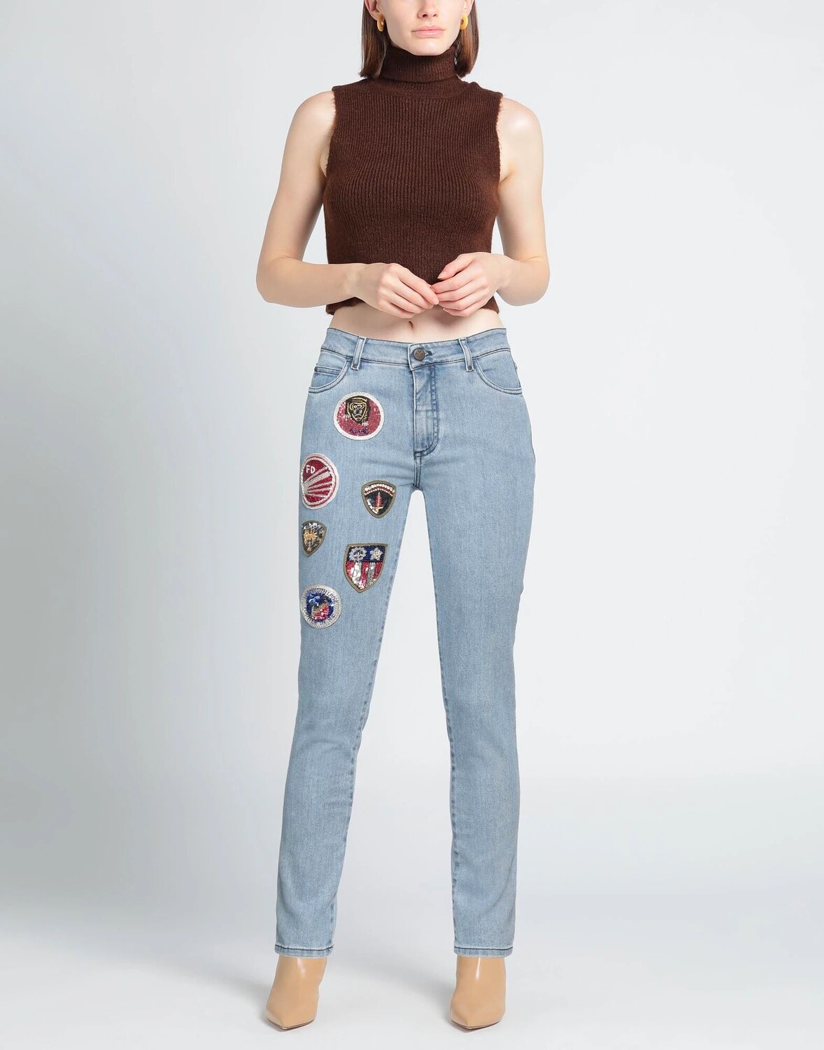Деним, выцветший, логотип бренда, кристаллы, одноцветное изделие с аппликациями, средняя стирка, средняя посадка, зауженная брючина, приталенный крой, 1 пуговица, застежка-молния, множество карманов, стрейч, машинная стирка, нельзя сушить в стиральной машине, не отбеливать, модель скинни