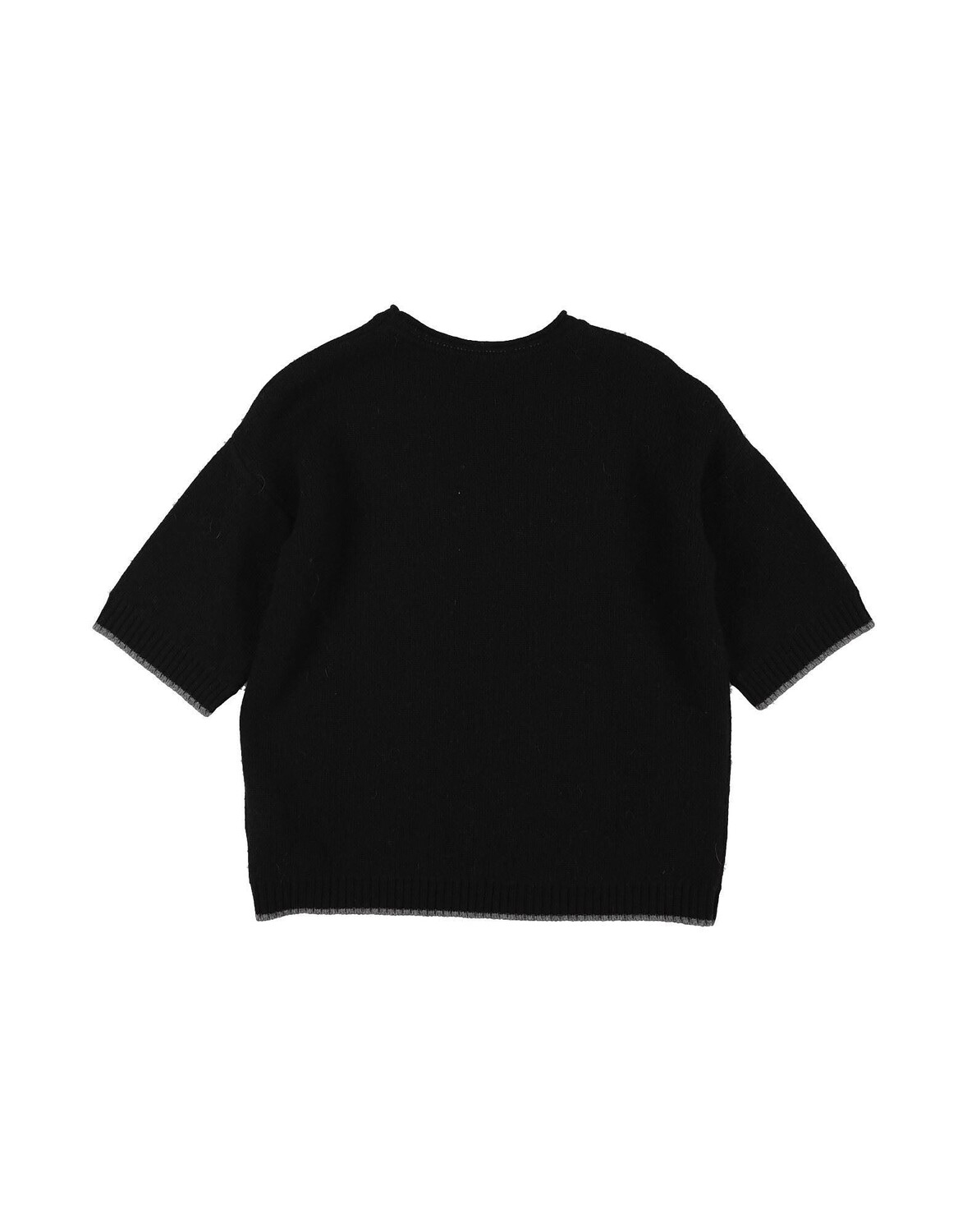 Трикотаж, легкая вязка, без аппликаций, двухцветный, круглый вырез, короткие рукава, без карманов, ручная стирка, химическая чистка, нельзя отбеливать, нельзя сушить в стиральной машине, гладить при температуре не выше 110°C.