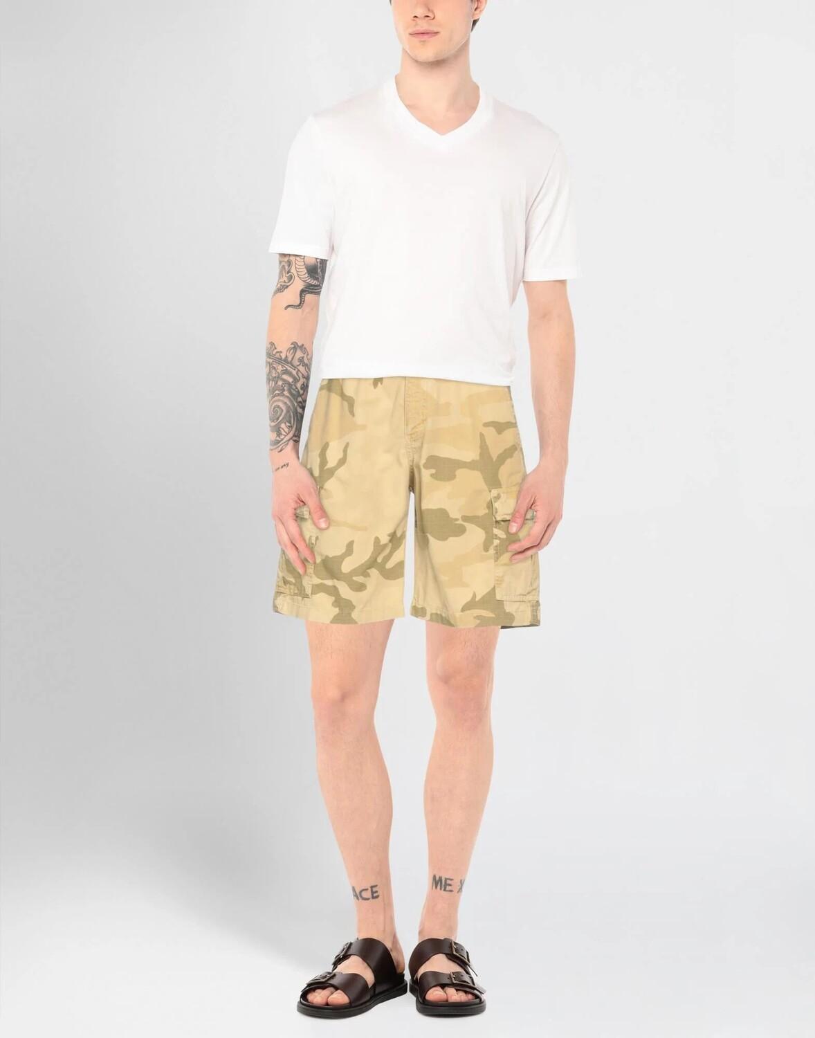 Полотняное переплетение, логотип бренда, камуфляж, завышенная талия, резинка на талии, широкие брючины, стандартный крой, 1 пуговица, застежка-молния, несколько карманов, карго