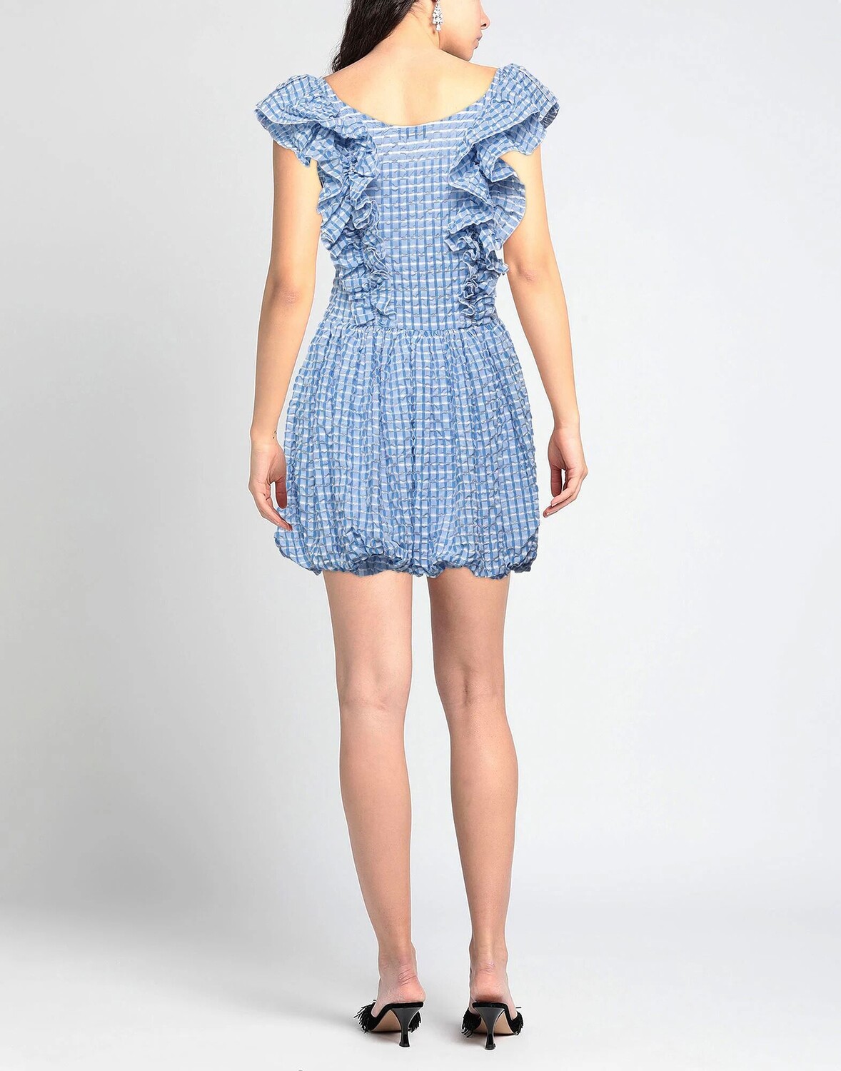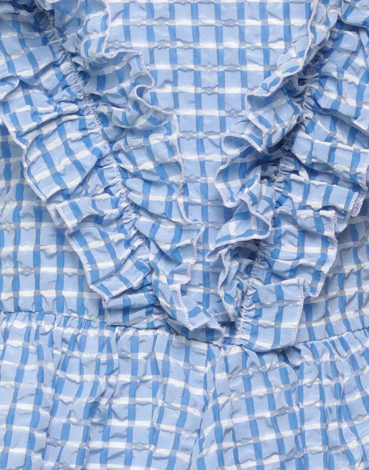 Полотняное переплетение, мятый эффект, оборки, клетка, глубокий вырез, короткие рукава, внутренняя часть на частичной подкладке, застежка-молния, без карманов, воздушный шар