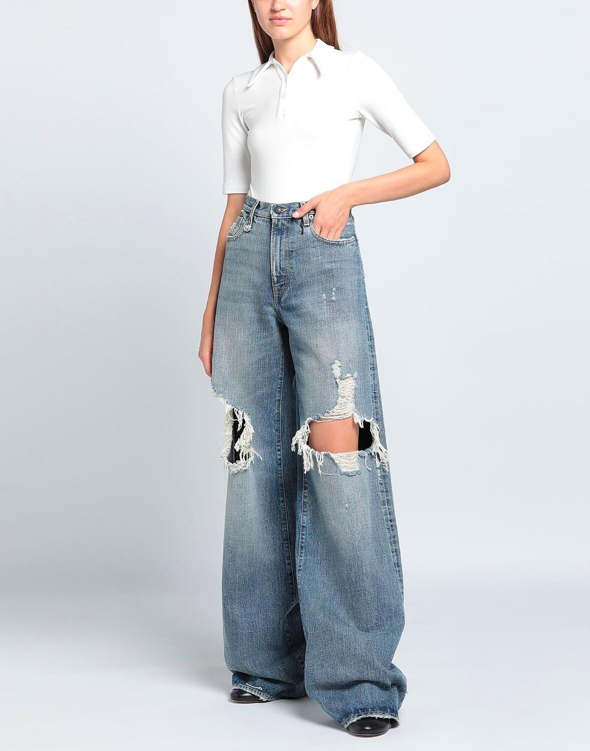 Деним, рваная ткань, без аппликаций, одноцветное изделие, средняя степень стирки, завышенная талия, широкие брючины, удобный крой, застежка-молния, 1 пуговица, несколько карманов, модель прямого кроя