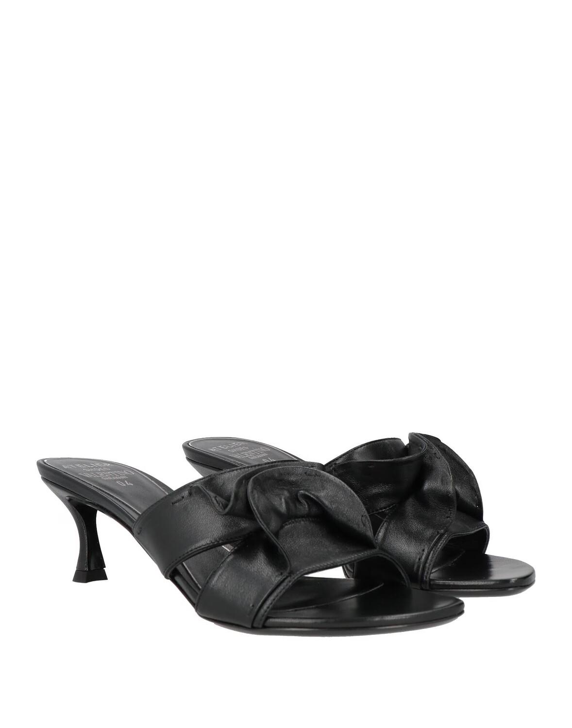 Кожа, оборки, одноцветное изделие, кожаная подкладка, узкий носок, круглый каблук, обтянутый каблук, кожаная подошва, содержит нетекстильные части животного происхождения, шлепанцы