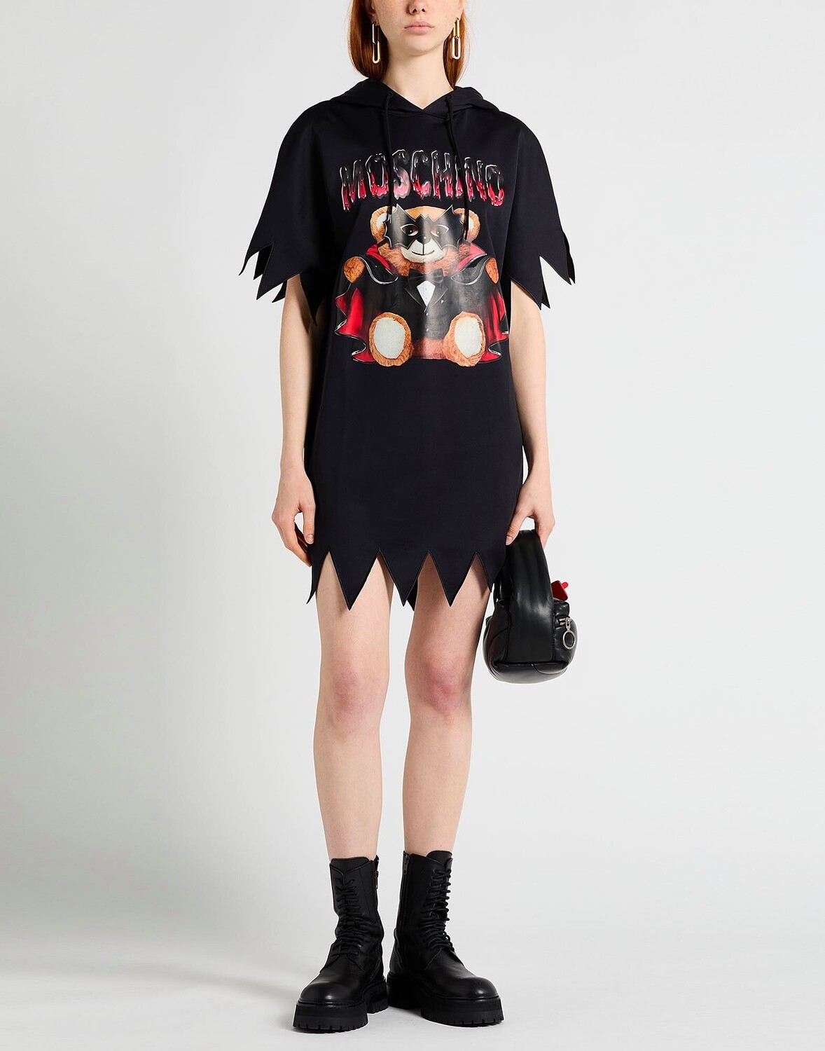 Платье-футболка, трикотаж, логотип бренда, одноцветное изделие с принтом, с капюшоном, короткие рукава, без подкладки, без карманов, ручная стирка или химчистка, нельзя отбеливать, нельзя сушить в стиральной машине