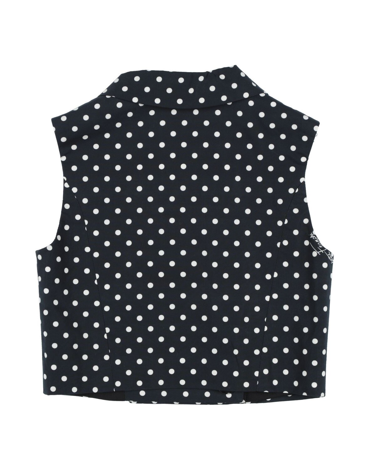 Полотняное переплетение, без аппликаций, в горошек, воротник с лацканами, двубортный, без рукавов, на подкладке, на пуговицах, без карманов, стирка при 30°C, не подвергать химчистке, не отбеливать, нельзя сушить в стиральной машине, гладить при 110°C макс., двубортный пиджак