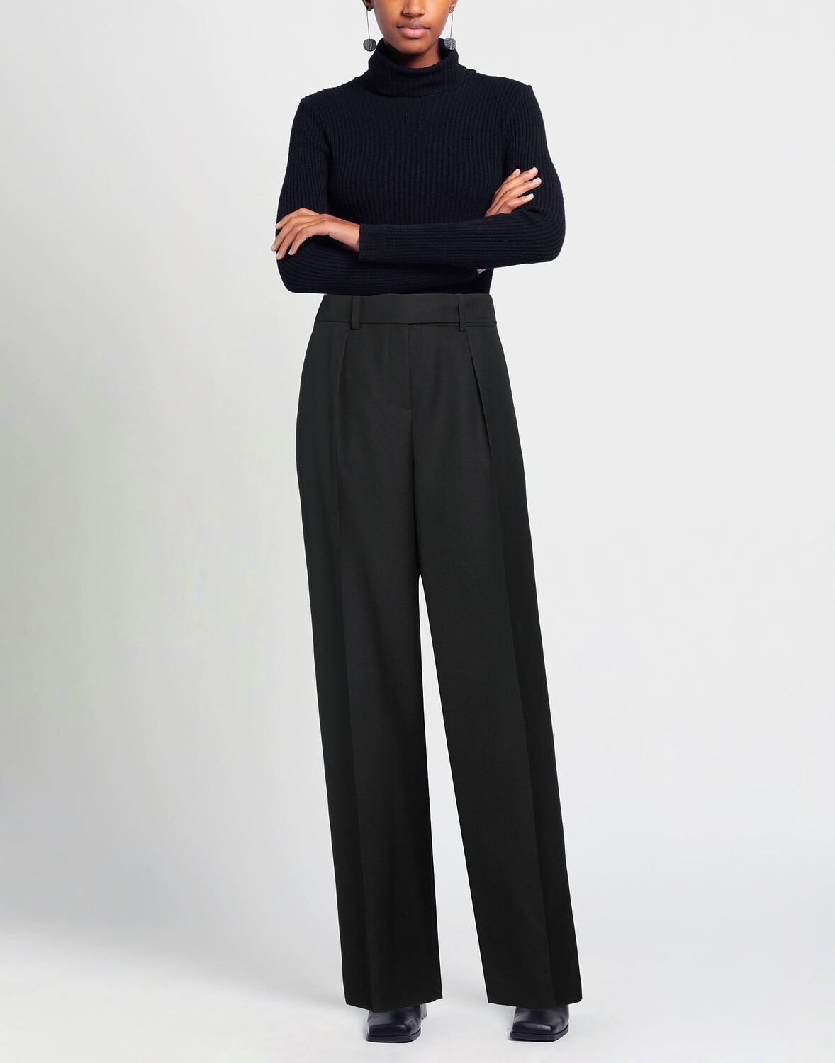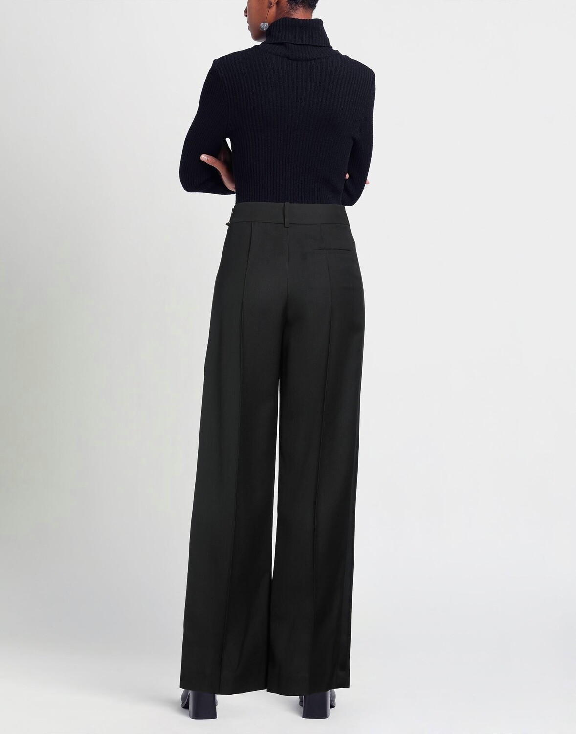Ткань, жаккард, полоски по боковым швам, одноцветное изделие, высокая талия, стандартная посадка, застежка на крючки, застежка-молния, множество карманов, химчистка, нельзя отбеливать, нельзя сушить в стиральной машине, широкие брюки
