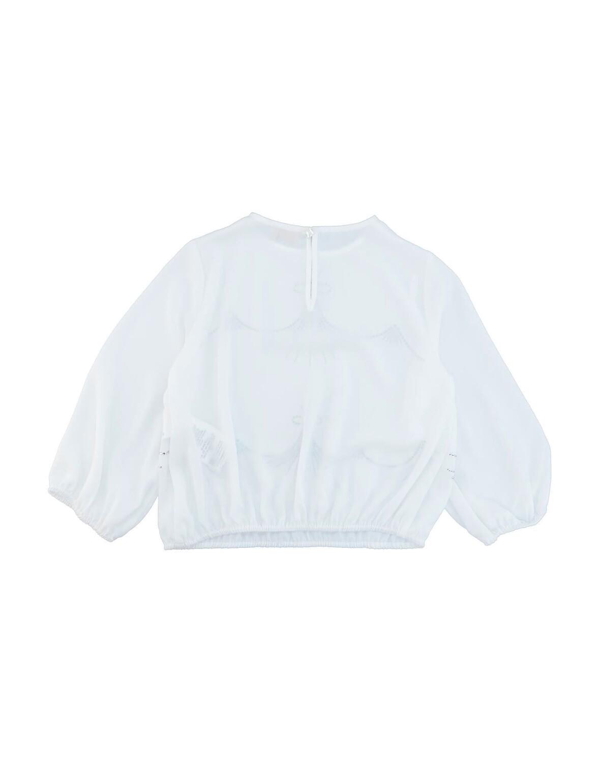 Креп, логотип бренда, кристаллы, одноцветное изделие, круглый вырез, длинные рукава, пуговицы, без карманов, стирка при 30°C, химическая чистка, нельзя отбеливать, нельзя сушить в стиральной машине, гладить при температуре не выше 110°C, маленький размер