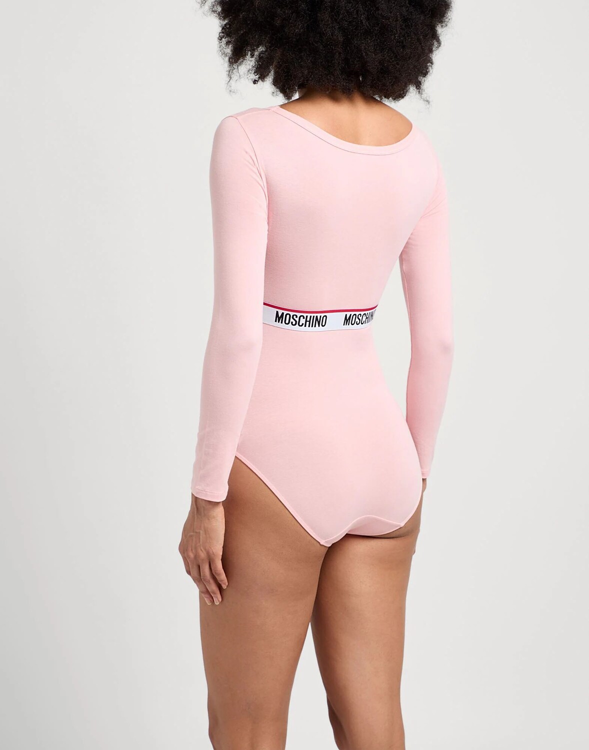 Трикотаж, логотип бренда, одноцветное изделие с аппликациями, круглый вырез, длинные рукава, застежка на кнопки, промежность тела, стрейч