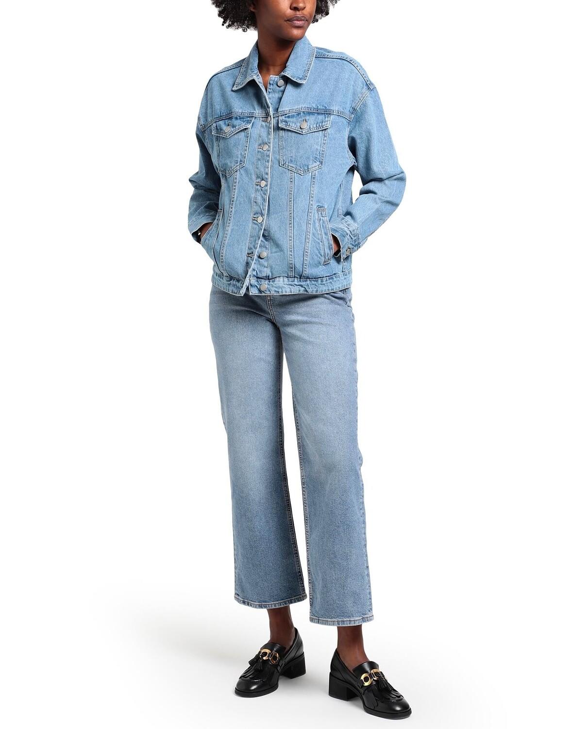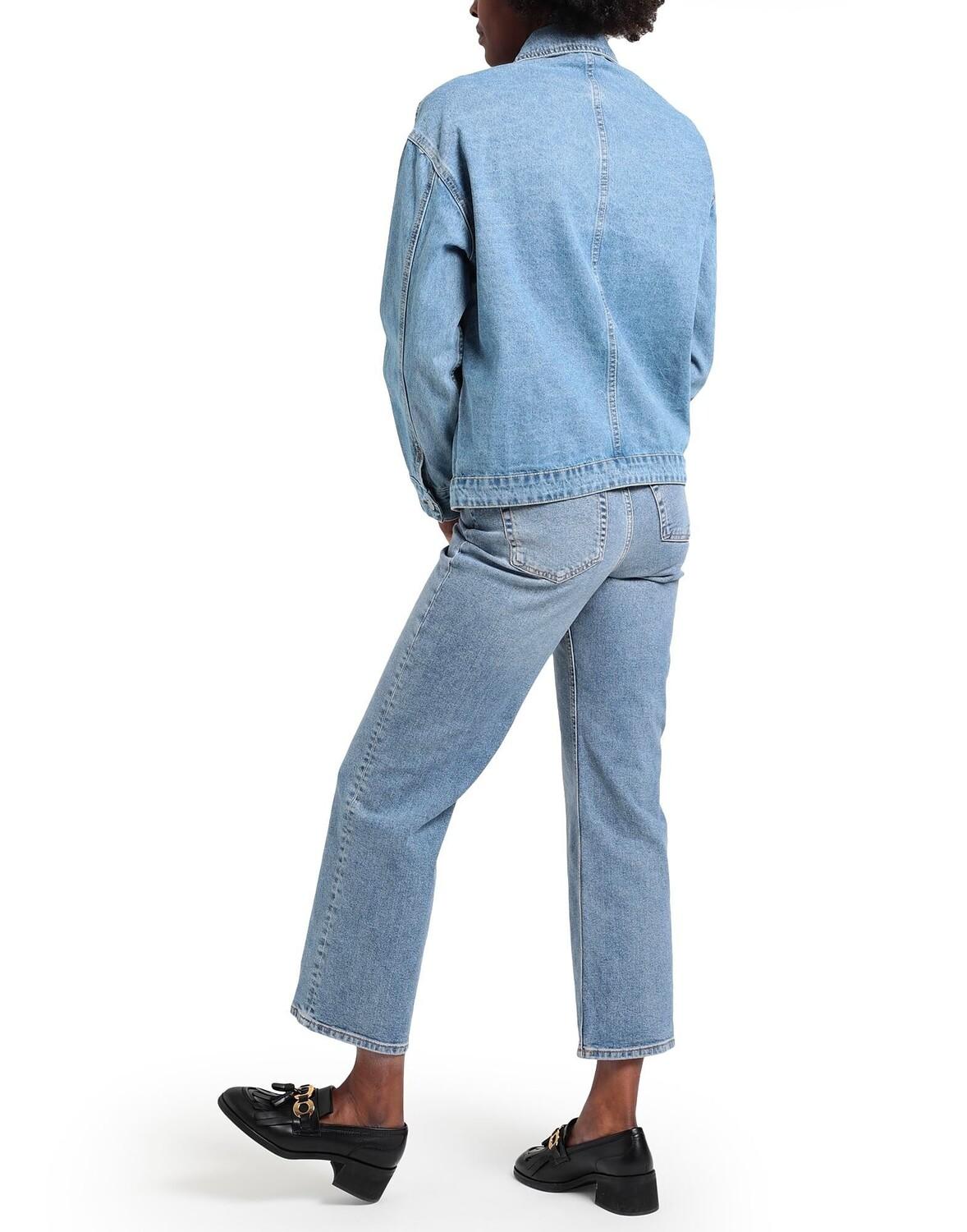 Деним, выцветший, логотип бренда, одноцветное изделие, средняя стирка, завышенная талия, прямые брючины, стандартный крой, застежка-молния, 1 пуговица, пять карманов, стрейч