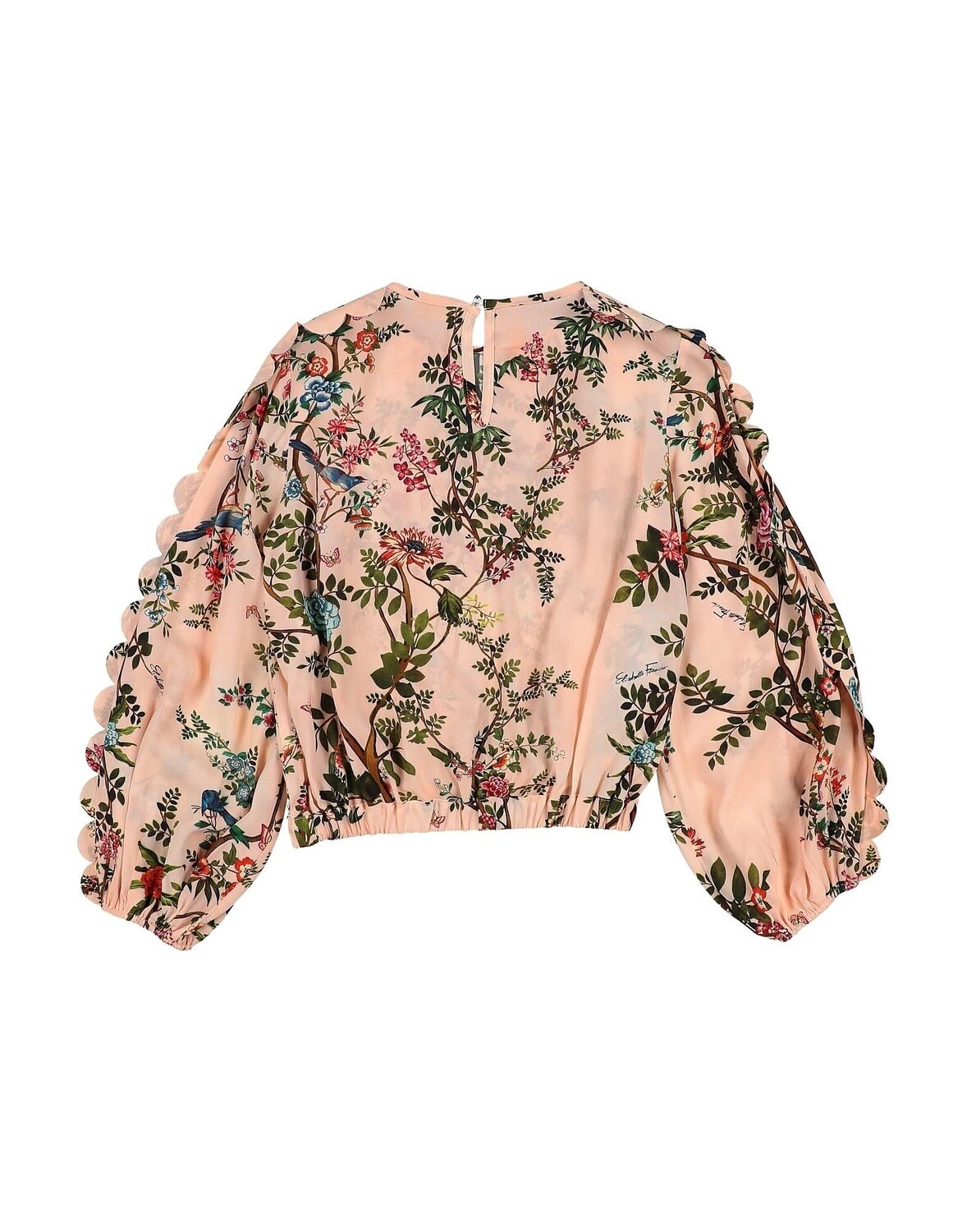 Креп, без аппликаций, цветочный принт, овальный вырез, длинные рукава, пуговицы, без карманов, стирка при 30°С, не подвергать химчистке, не отбеливать, нельзя сушить в стиральной машине, гладить при температуре не выше 110°С, маленький размер