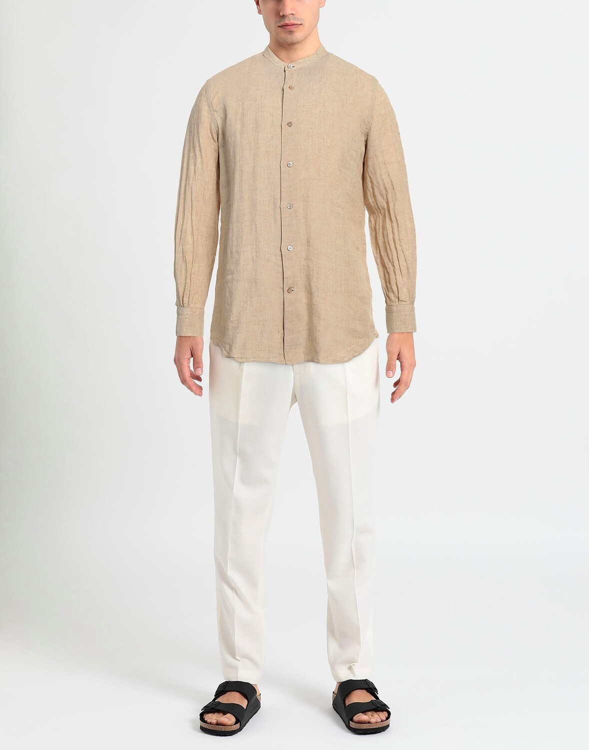 Рубашка обычного кроя, лен, однотонное изделие, без аппликаций, воротник-стойка, длинные рукава, манжеты на пуговицах, застежка на пуговицы, машинная стирка или химчистка, не отбеливать, не сушить в стиральной машине.