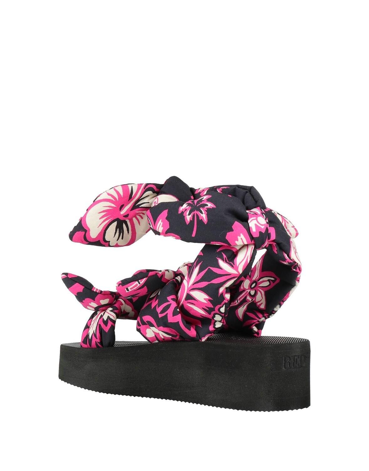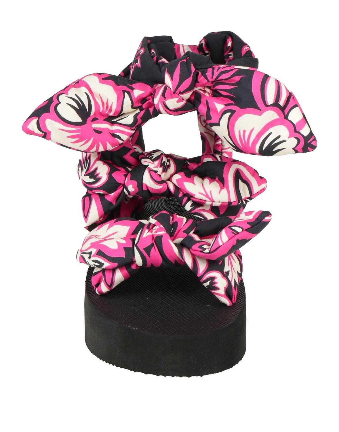 Ткань, бантик, логотип бренда, гавайский принт, внутренняя часть из ткани, завязки на щиколотке, круглый носок, каблук-танкетка, резиновая подошва, босоножки на шнуровке