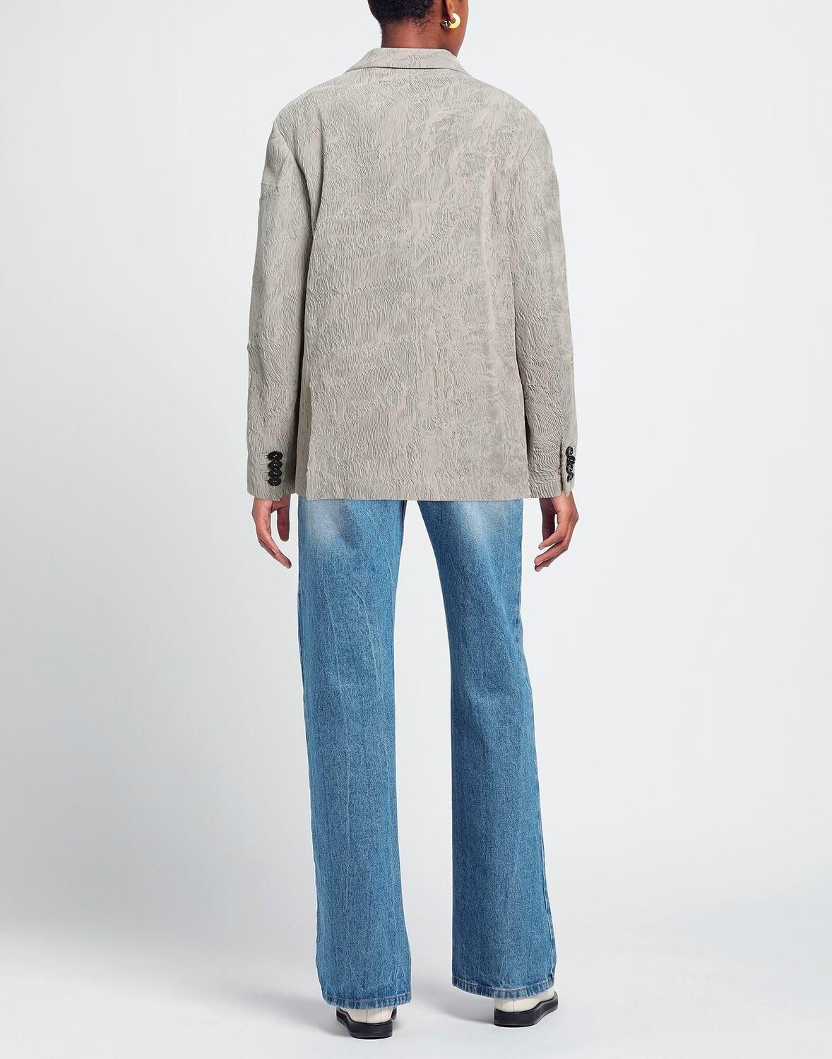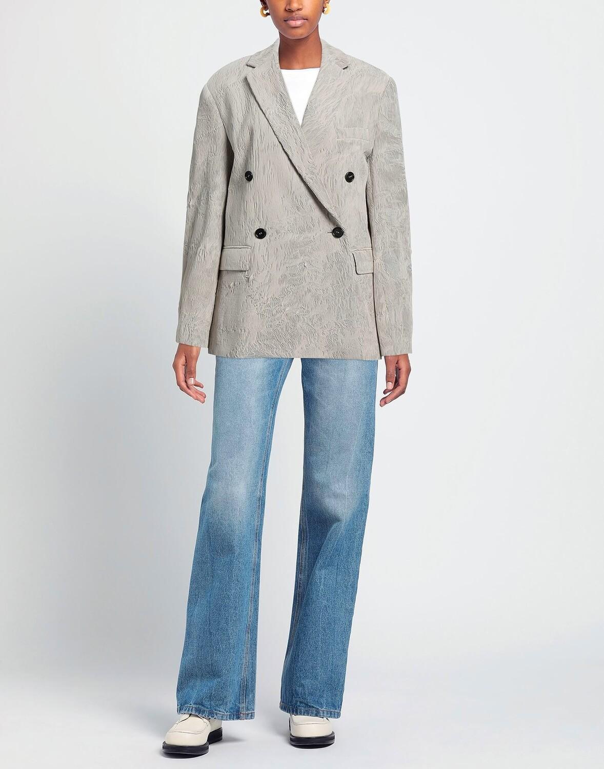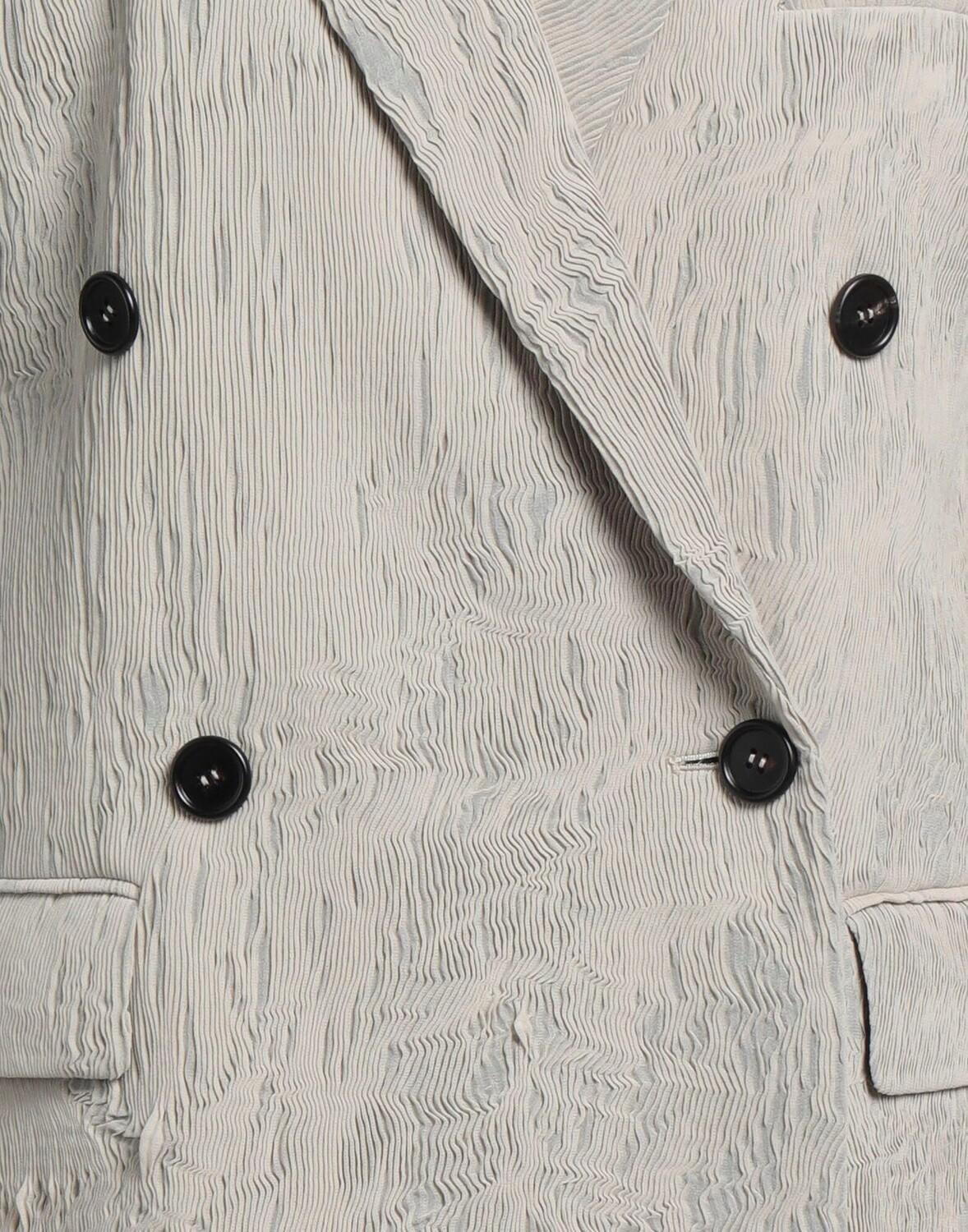 Полотняное переплетение, эффект мятости, без аппликаций, одноцветное изделие, воротник с лацканами, двубортный, длинные рукава, манжеты на пуговицах, внутри на подкладке, пуговицы, множество карманов, двойные шлицы сзади, двубортный пиджак